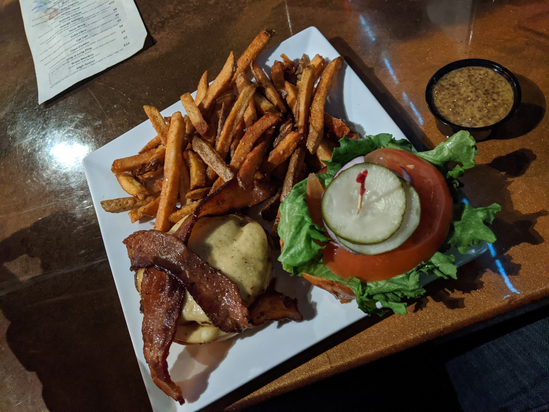 Read moreArrived and had a cold walk to the front door. For a Friday night, it seemed pretty relaxed with a small amount of patrons which was lucky for me since I don't really like very large crowds at bars. Old arcade cabinets and pinball lines the left side of the downstairs dining area, complete with its own bar and a staircase leading up to another, larger bar with much more pinball machines and a few more arcade cabinets. It didn't seem like there were very many if them, but as I kept walking around I found more and more games which pleased me. There is a large room filled with cabinets, one side dedicated to co-op games like Mortal Kombat and TMNT and the other to more classic ones like Pac-Man and Centipede. There is a skee-ball area which we definitely got good at while we played around with the games. We were greeted by a nice server who promptly brought us water and menus (themed with video game inspired names for dishes). We ordered a mozzarella stick basket (5 sticks) which came with fries and instead of marinara, a penne sauce for dipping, which was very tasty. We both had the burger with fries for our entree and it was pretty run of the mill for a cheeseburger. I opted for a double smash bacon cheeseburger (smoked Gouda) with lettuce, tomato, onion, pickles, mushrooms and grilled onions. It arrived with a toasted bun and toothpick holding my toppings in place with a lot of fries on the side. after taking a few bites, I noticed my mushrooms and grilled onions were absent from the burger, but that's okay I was so hungry I didn't mind. I was not charged for them so I cant complain. 7/10 burger I'd order again. The fries were good, cut with the skin on, giving a nice texture to them. I could see some complain about the amount of salt on the fries, large flakes clearly visible on them. I thought they were good, but order with reduced or no salt if that's not something you can handle. I recommend visiting this establishment if you enjoy retro games (they're only a quarter a play which is very very reasonable) and pinball and booze. Seems like I could spend a lot of time here and I...