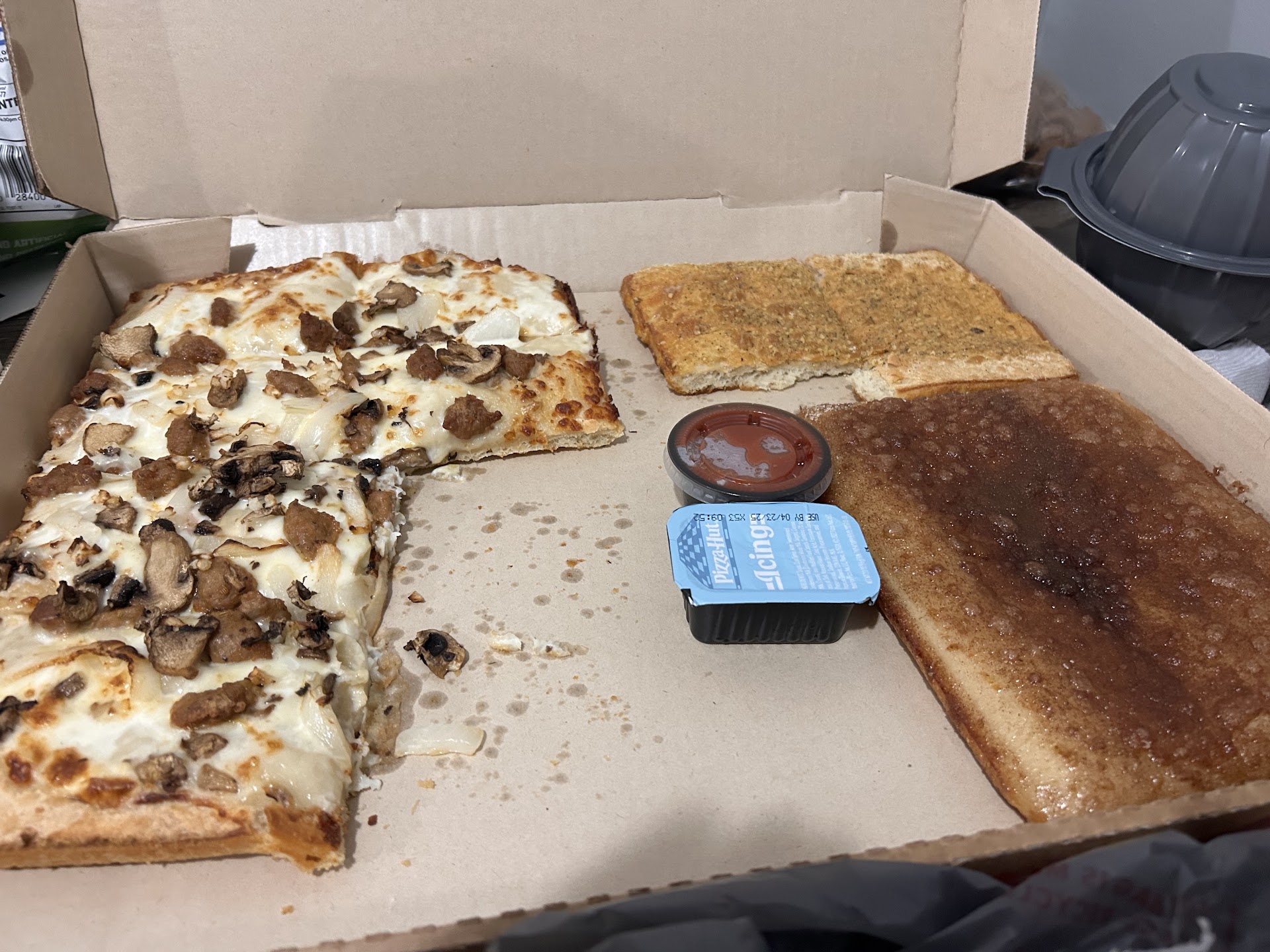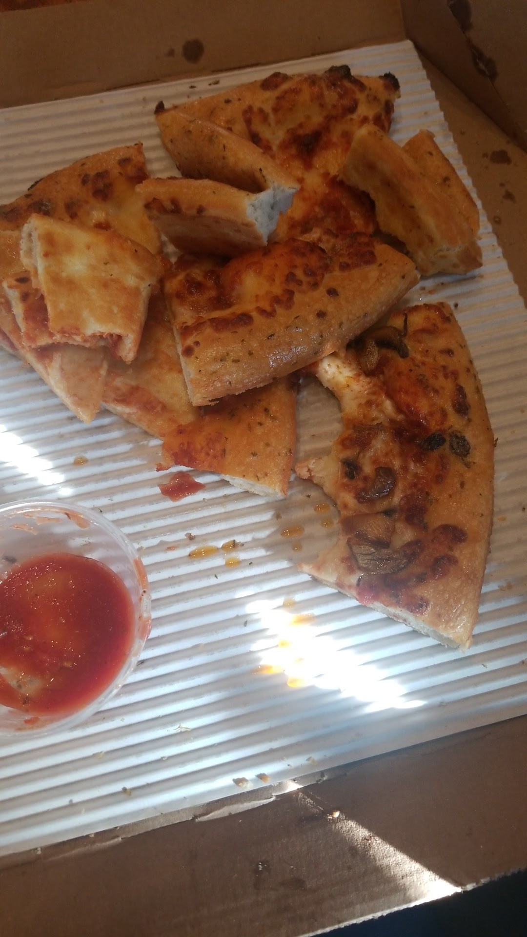 Again, the store was DEAD. 5 seated customers in the store. Saw 3-4 take-outs and one delivery while there. The buffet pizzas were all unpopular varieties and looked like they were old - cheese was dried out. They were warm because of the buffet design but definitely not 'fresh.' Not ONE fresh pie was set out while I was there. No one offered to change to a personal pizza or anything while there. The salad bar was stocked OK for the most part. The items looked semi-fresh. Was out of shredded cheese and no employee checked the bar status. Pasta bar was disgusting. the pastas looked horrible, bread sticks were gone and none were put out.