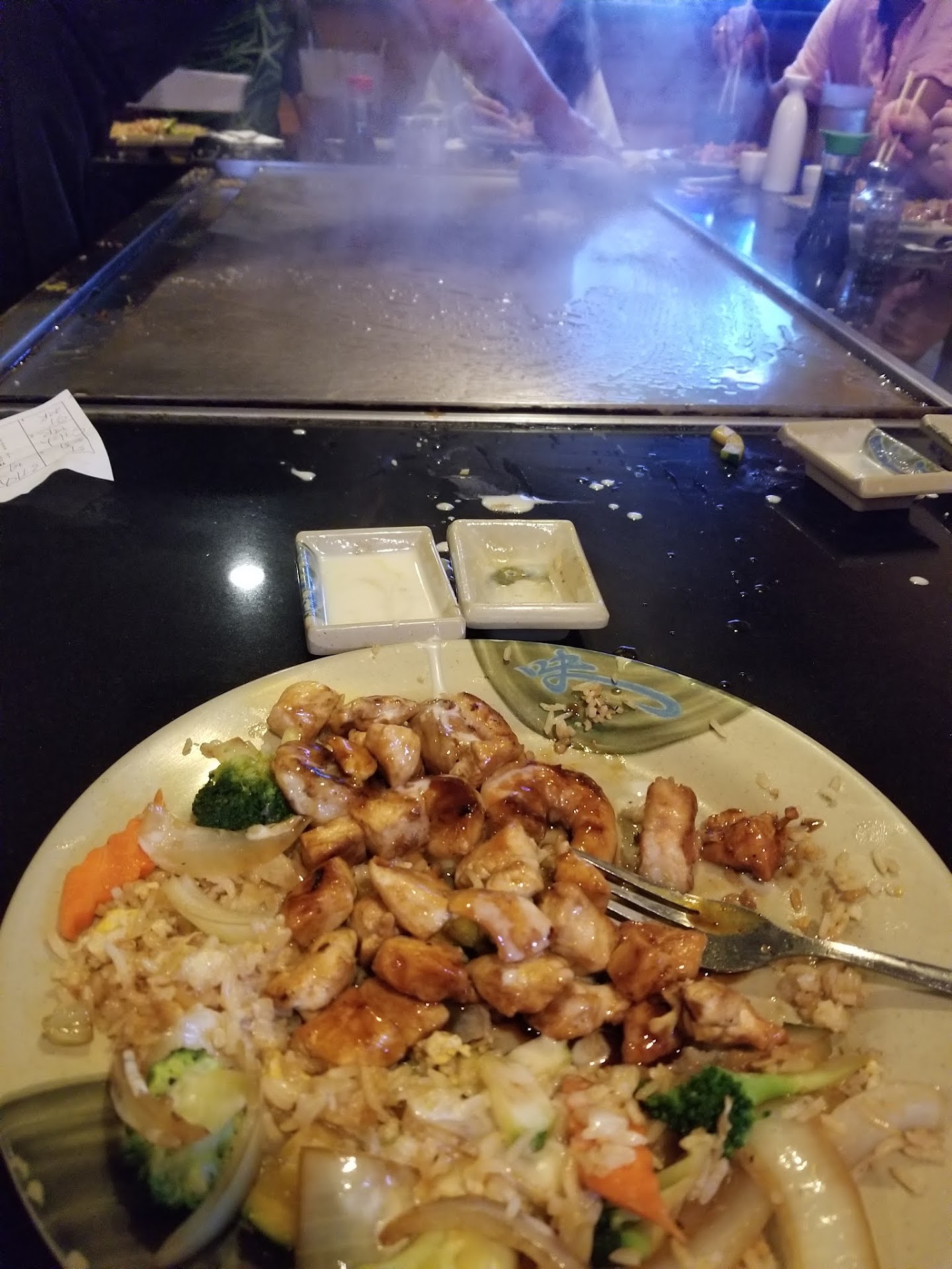 Torn between two stars or three. If I could sum up my experience with this restaurant in one word, it would be: unremarkable. Let's start with the ambience...rather dark and dingy - either replace current light bulbs with brighter LED ones or add more/better lighting. Poor lighting coupled with outdated décor created a rather depressing mood. Service: no issues, but my girlfriend and I were the only ones dining - the place was otherwise void of customers. Presentation/Entertainment Value: Ordered hibachi, which usually means gathered around a hibachi grill and provided a presentation of some sort by the "chef" (knives clanging, onion fireball volcano, quirky comments/jokes, shrimp appetizer flipped to catch in one's mouth, etc.). Well, there was really no presentation. I felt cheated - no shrimp appetizer! No fireball onion volcano! No quirk jokes/comments from the chef! Food: Edible, but bland. Fried rice had no butter melted on the grill beforehand and no seasoning added while cooking. Yum Yum sauce looked more like ranch dressing and didn't have the same taste as all the other yum yum I've had elsewhere.