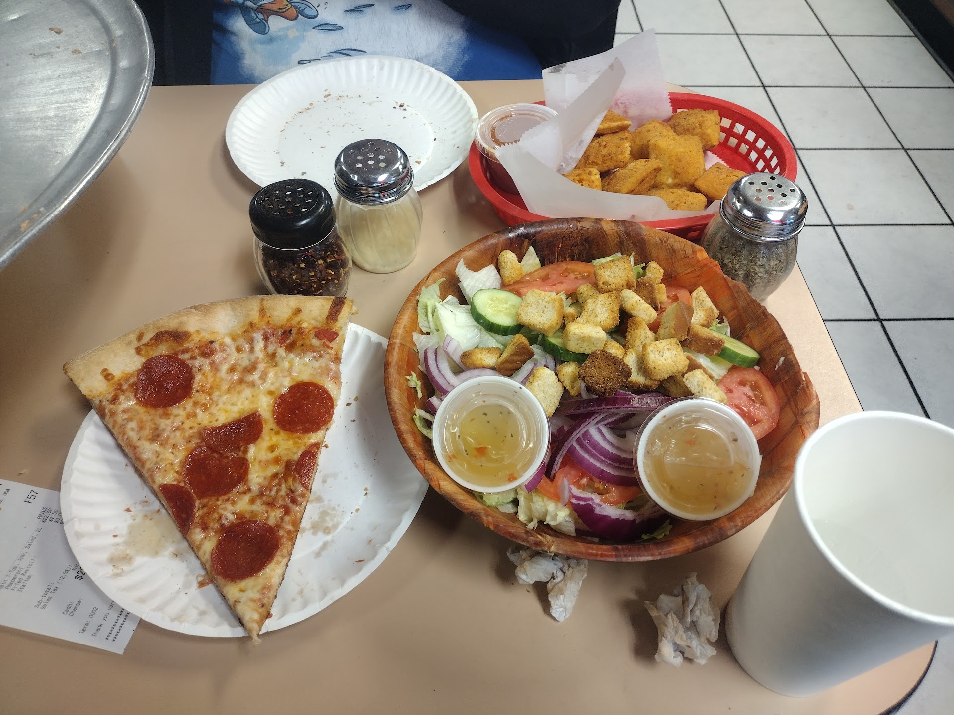 I ordered their lunch special 2 slices to go: 1 of pepperoni and 1 of cheese plus a fountain drink for $4.80. This is what I thought, in the order of my experience.