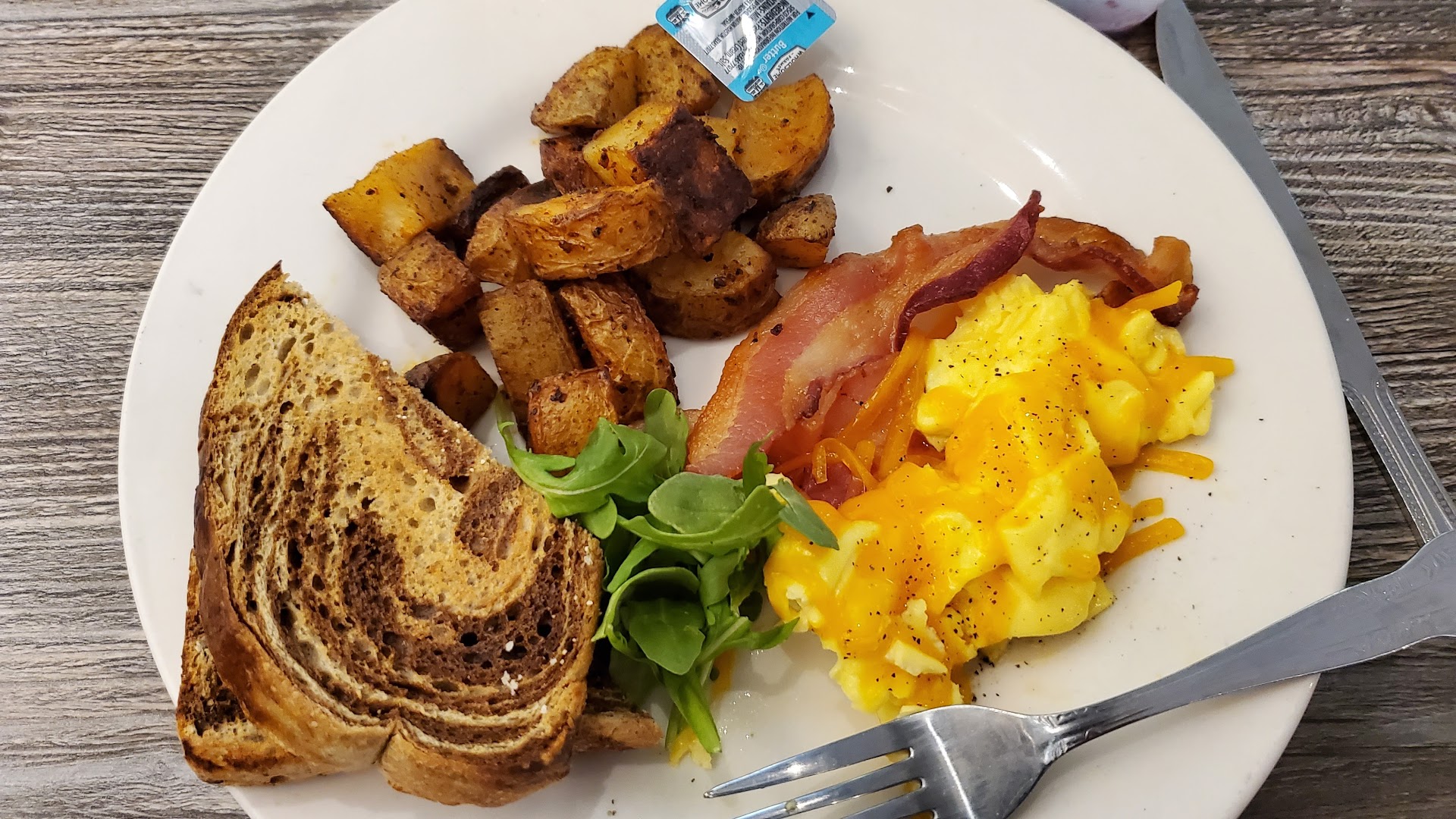 The Starving Artist Special was their breakfast plate of bacon, eggs, potatoes, and toast. Bacon was perfectly crispy as requested. The eggs were missing the cheese that was requested so it was brought out after. The disappointment with that is the cheese never melted.