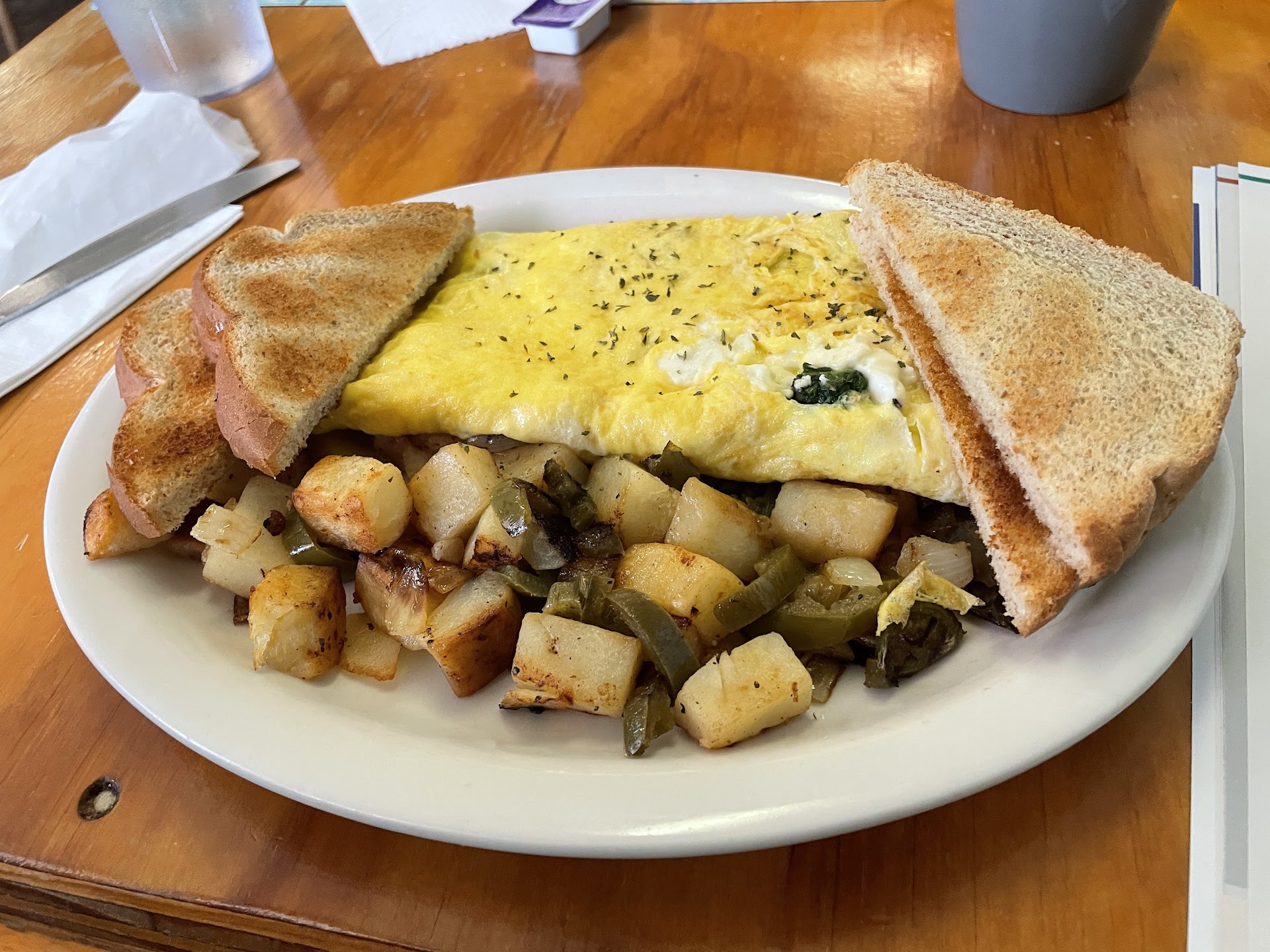 On the positive side, the restaurant was clean, and it was clear that locals frequent this spot, as they seemed to know exactly what they wanted. My food arrived hot and was delicious, particularly the omelet, which was perfectly cooked and flavorful. Unfortunately, the coffee was just average, not particularly memorable.