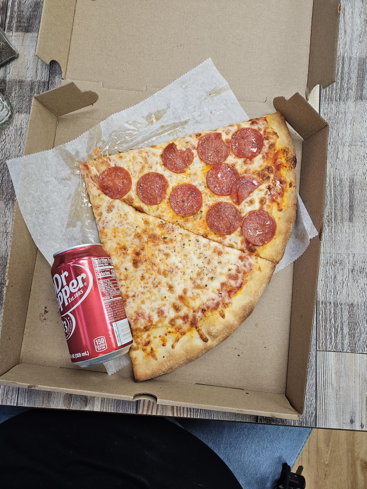 Read moreFirst, I think this place is surprised at the amount of business they have and that is what has caused delivery order issues. I have been here about five times. I get two slices to go. It can take five to 10 minutes to get my slices. I had only come on weekdays until today. I went on a Saturday and there seemed to be some confusion at the counter. Three workers. Two came from the back as I was ordering. I guess that's why my ticket didn't go up on the board. They checked into it after I had waited awhile. I didn't have to ask. They had to make it because it didn't happen. They said it would be 7 minutes for my slices. Things happen. When I did get my slices instead of two cheese, it was one cheese and one pepperoni. I was not going to say anything at tat point. This is the first time I have had an issue. There are 7 four-top tables. Two are sometimes being used to make pizza boxes. No coke products. Boo. The slices are large and foldable. There many types of pizza. This is a thin foldable slice that is not charred. This is my type of pizza. Dr pepper in photo for scale. Didn't have a 🍌.