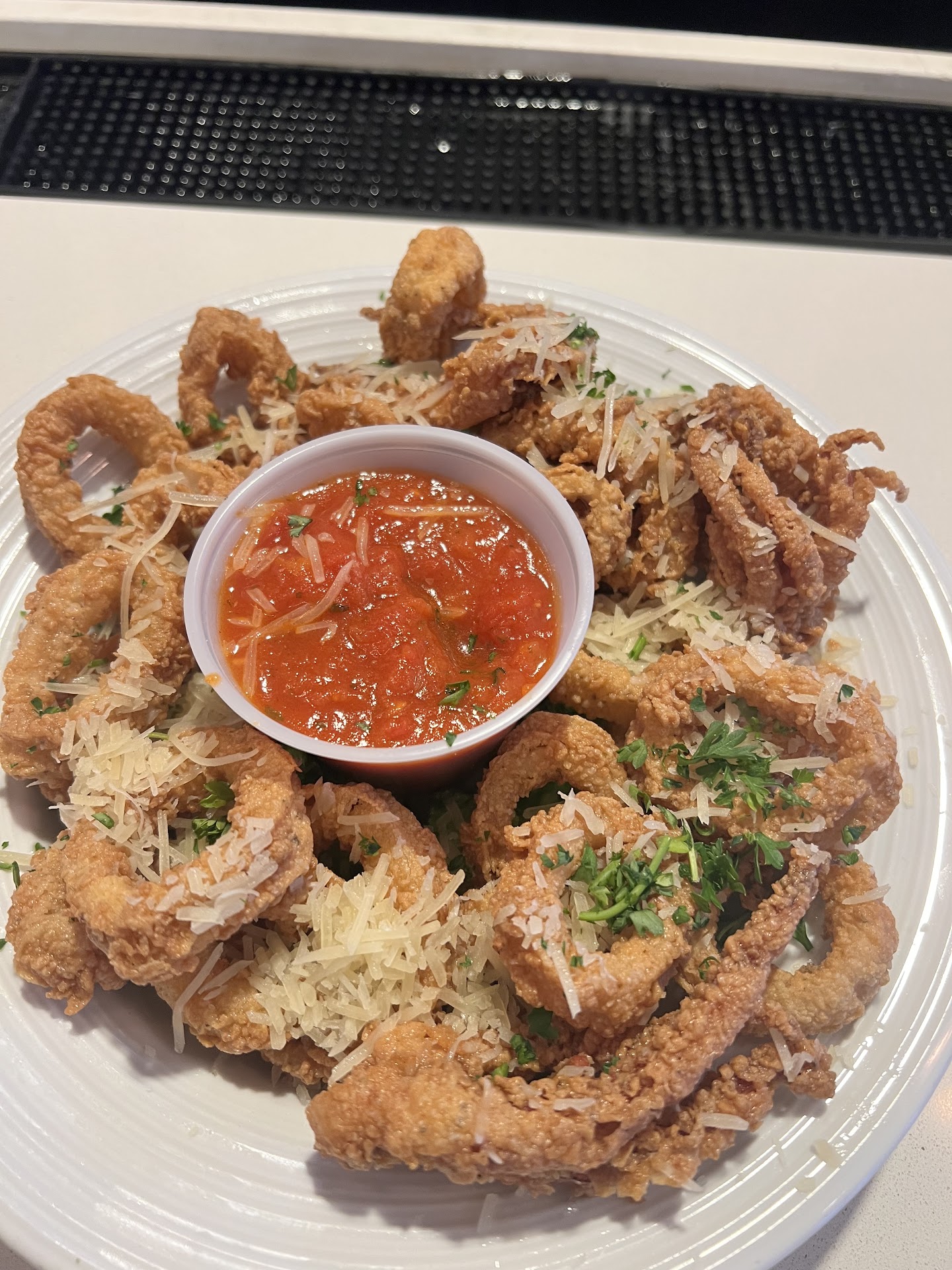 We had the She Crab Soup, Calamari, Chesapeake Bay Drunken Crab and CheeseDip with Fried Naan Bread, Fried Green Tomato, Chesapeake Bay Jumbo Lump Crab Cake, Wild Mushroom Ravioli, and Key Lime Pie with Key Lime Mousse, and I had the blueberry margarita.