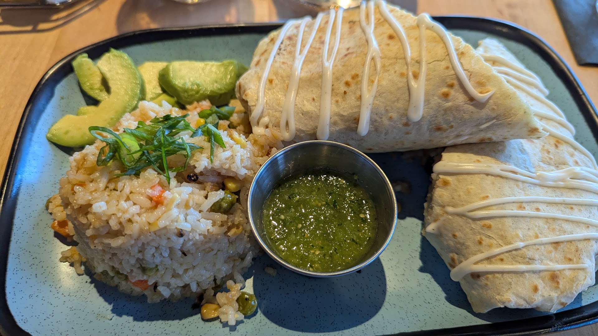 The drinks were fine but nothing to write home about and added 10$ onto the meal that was all and all unnecessary. The burrito was very tasty despite the hefty amount of rice inside it. They also gave rice on the side. Good thing it was delicious so I didn't mind it too much. I also appreciated the generous amount of avocado and the delicious green sauce. I will note that the vegan cheese was clearly purchased in slices and then diced. Parts of it did not melt and stuck together, resulting in large chunks. If you've worked with vegan cheese you know this is a bit of a rookie mistake so I hope to see that corrected. I LOVE to see vegan options but it's hard to pay this much for it when you know you could make it at home (I asked and the use Just Egg for the egg replacement).
