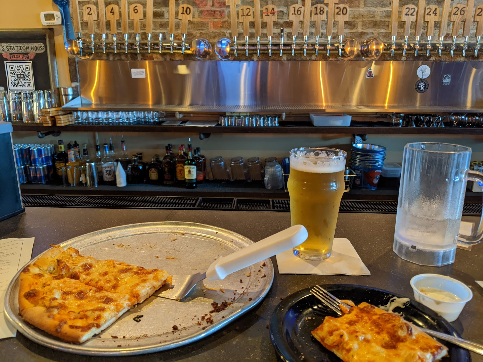 Another 10 minutes go by an our dinner arrives. One was right and the other wasn't. Ordered the smallest pizza, well done with light cheese, got a pizza that was kind of hot but barely cooked through and swimming in cheese. The top of the slices were hot, the bottom weirdly not. Pointed it out to the server who countered with, "Do you want him to remake it?" Pressed for time we passed.