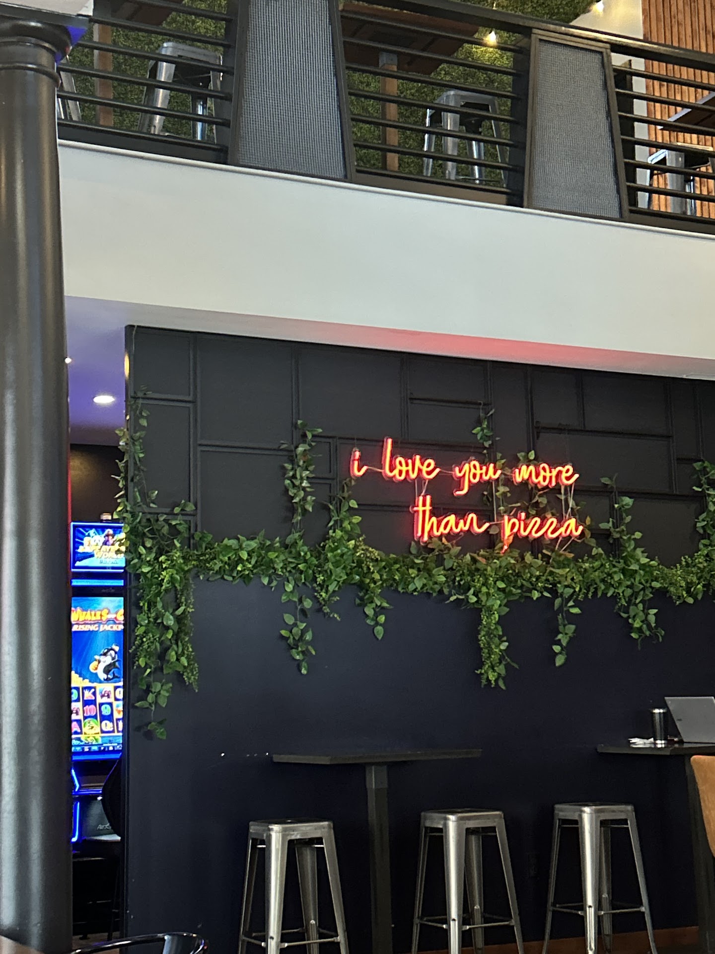 The motif was a unique blend of pizzeria, sports bar, and club. The tables, chairs and furnishings were both sleek and comfortable. The lighting created a warm and inviting atmosphere. The bar was quite appealing with a well stocked variety of adult beverages.