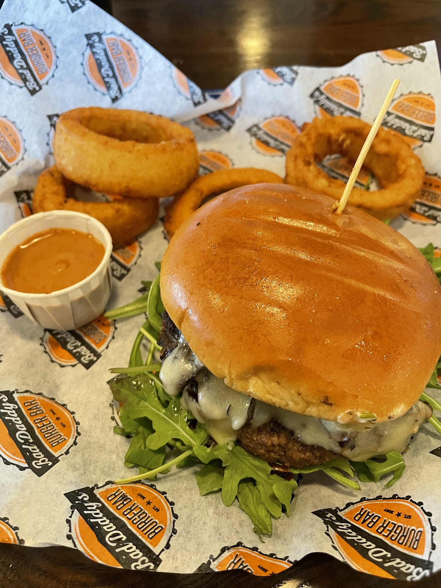 She topped hers with American cheese, Applewood bacon, onions, lettuce, tomato, and Bad Daddy's sauce on a brioche bun..
