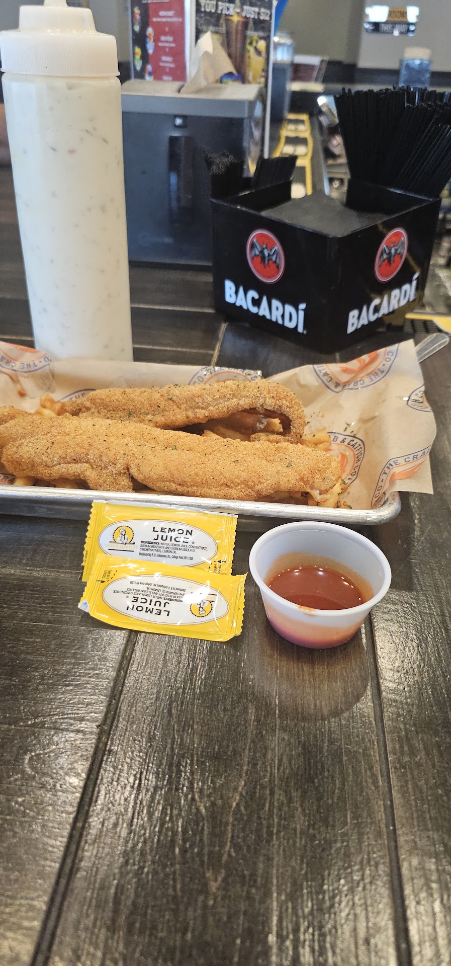 Read moreWaiting on a friend to meet me nearby with time to spare, i wanted to find a bar for a couple of drinks. Crab & Catfish Co. was just a couple of blocks away, so I strolled over. I opened the front door and immediately saw Miss MeMe behind the bar and ever so friendly patron talking. They immediately welcomed me in. I asked if I could sit with them for a while, and they both happily accepted. I bellied up to the bar and had a menu and was asked what I wanted before my butt hit the seat. I ordered a vodka/cranberry and said I'll hold off on food for now. My drink was exactly how I like them, more grains than fruits 😋. I chatted up Miss MeMe and the patron for a bit and began looking over the menu. The patron ordered some food, and I was doing pretty with just my drink until that marvelous aroma of Cajun shrimp spiced shrimp, corn, and potatoes hit my nose holes Miss MeMe obviously knew where my brain was going and asked again if I was good with my drink only and that they have a wonderful 2 fish & fries basket. I happily accepted. My food came out quickly and was too hot to touch. After what seemed like hours of the delicious smell, I couldn't wait anymore. The fries were perfectly crispy along with nice catfish fillets in a cornmeal, perfectly seasoned batter. I ate my entire plate, and all the while, MeMe made sure I was doing good. So, if you're in Norman and even if you're not, you need to go have some good food, drinks, and visit with...