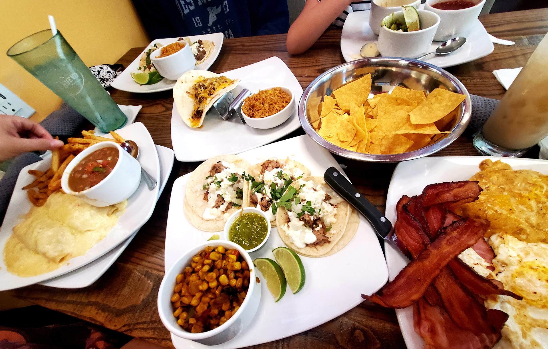 ย ย ย Read moreThis restaurant is a novel/unique mexi-breakfast concept (with a bar that opens at 8am. hahaha. lol), although they have extended their hours to lunch & dinner as well. That means the menu is different/unusual in a good sort of way. It's definitely not your traditional tex-mex place! So, the standard table setup does not include chips, queso or salsa. That'll set ya back about $8. Btw, the chips are served warm, the salsa is decent and the white queso is good too. It just needs to be thickened up a bit. I ordered the lunch/dinner enchiladas and they were delicious. The ranchero (red) sauce is spicy and has a kick. Can go hotter/spicier with the green chili sauce or substitute queso for a little less umph if you wish. My daughter got the mexi-French toast (yes, you read that right) with a carmelized banana sauce and fresh fruit topping. Omg! It made me wish I'd ordered a breakfast item instead! It was incredible! Seriously, I should have ordered a mexi-breakfast item! We were there for a late lunch. So, there was almost no wait to be seated. The food was served fast. And, our server, Rhonda, did a fantastic job. A manager even came around just to check on our table. That makes this an easy 5 star review! It's a new concept/place that's still adapting/changing to meet the market and staffed by folks who actually seem to care about what's going on. And, it shows! That's a formula for success in my...