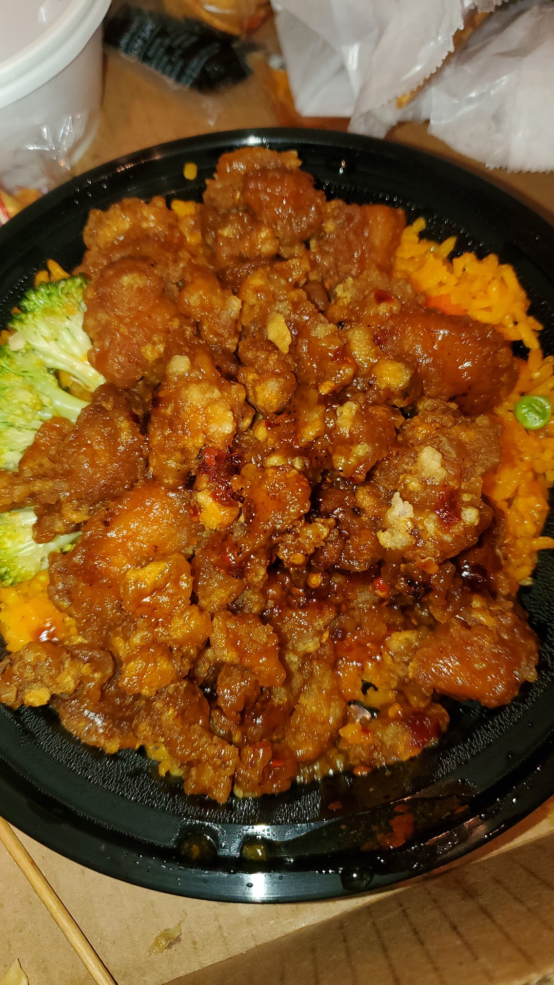 I also got a small chicken fried rice. The rice was orange and the chicken had a weird texture. It was flavorless. Took 1 bite and tossed it.