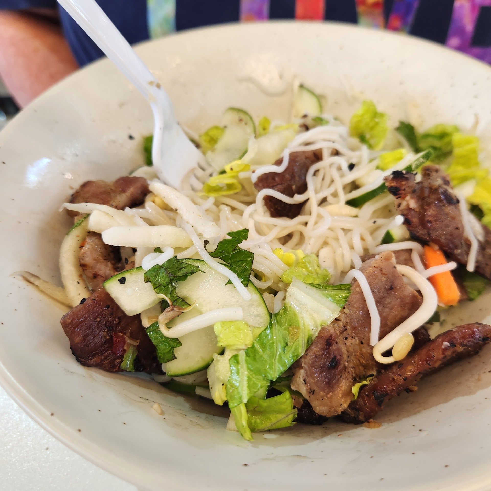 I tried the Black Milk Tea with boba (my go-to "bellwether" when trying a new boba place) and the Pate & Pork BBQ banh mi. The tea was subtly sweet with perfectly soft and springy boba - one of the few boba places I've ever been to that doesn't drown their tea in sugar (and I didn't even have to ask for reduced sugar). My banh mi was equally fantastic, filled with tender slices of pork and slathered with luxurious pâté, and topped with perfectly crisp vegetables/herbs. My partner got a grilled pork vermicelli bowl, which was equally delicious and easily outshines similar bowls/bún that we've gotten in OKC.