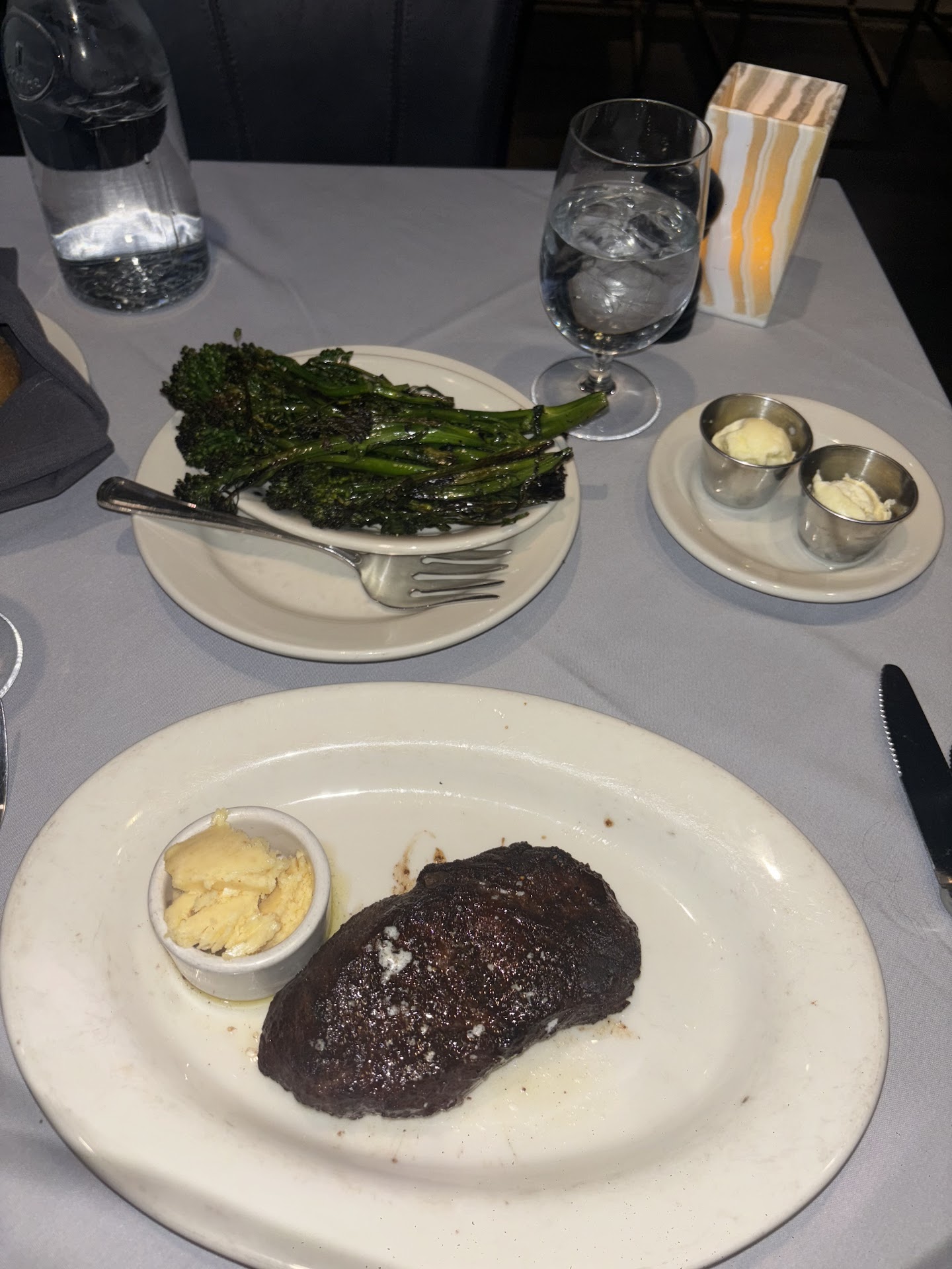 Unfortunately that is not the case and after spending $250 on a meal I would expect to be happy when I left but that wasn’t the case at all. The appetizer and salads were wonderful, I asked for my steak $100 bone-in ribeye to be medium at the bone because it usually is undercooked at the bone, knowing this could mean my steak would be medium well to done on the outer edge but I am okay with that because I cannot do medium rare especially on a fatty cut like a ribeye. I do not send food back at restaurants as I don’t know what they do to it as it is an insult to the cooks (who should know what medium is) and my sides were okay, the au gratin potatoes were good, next time if I ever go back I will do a baked potato but the asparagus was horribly burnt, they call it charred but it was burnt and had a rancid taste, will not order that again…especially at $12 each for a side. Again, I don’t send food back at restaurants, it isn’t good Karma for the customer.