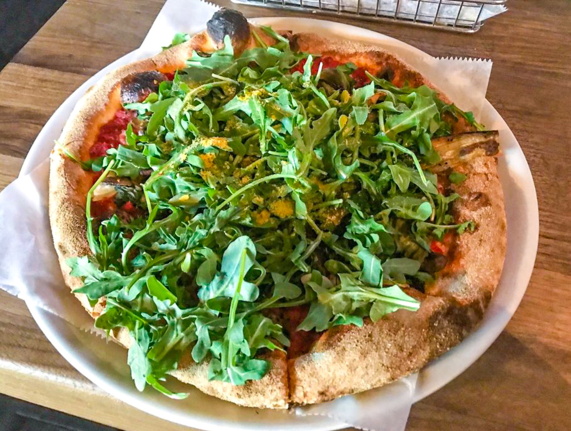 I had a mojito and it was refreshing, but it felt like it was non-alcoholic. I had another cocktail and it was the same way, very, very light. On to the pizza. I ordered the vegan arugula pizza because, well, it was the only vegan option. Based on the description, it could have been great. When the pizza came out, it looked like a pizza crust with a ton of arugula thrown on top and a random shake or two of nutritional yeast. When you picked up a slice, the toppings just slid off the pizza. I struggled to take a bite, as everything fell off the slice. There wasn't much sauce, there was no cheese and the few toppings that were hidden under the arugula were sparse. We're talking like one strip of eggplant, a couple of small mushrooms and yeah. Vegan doesn't have to be boring and I just didn't quite know what they tried to do with this pizza. The dough was good, but it was put together very poorly. I do want to reiterate, the atmosphere here was great. Our waitress was very friendly. I just can't see myself coming back since they only have one vegan pizza option that was very underwhelming and the alcoholic drinks were far too light...