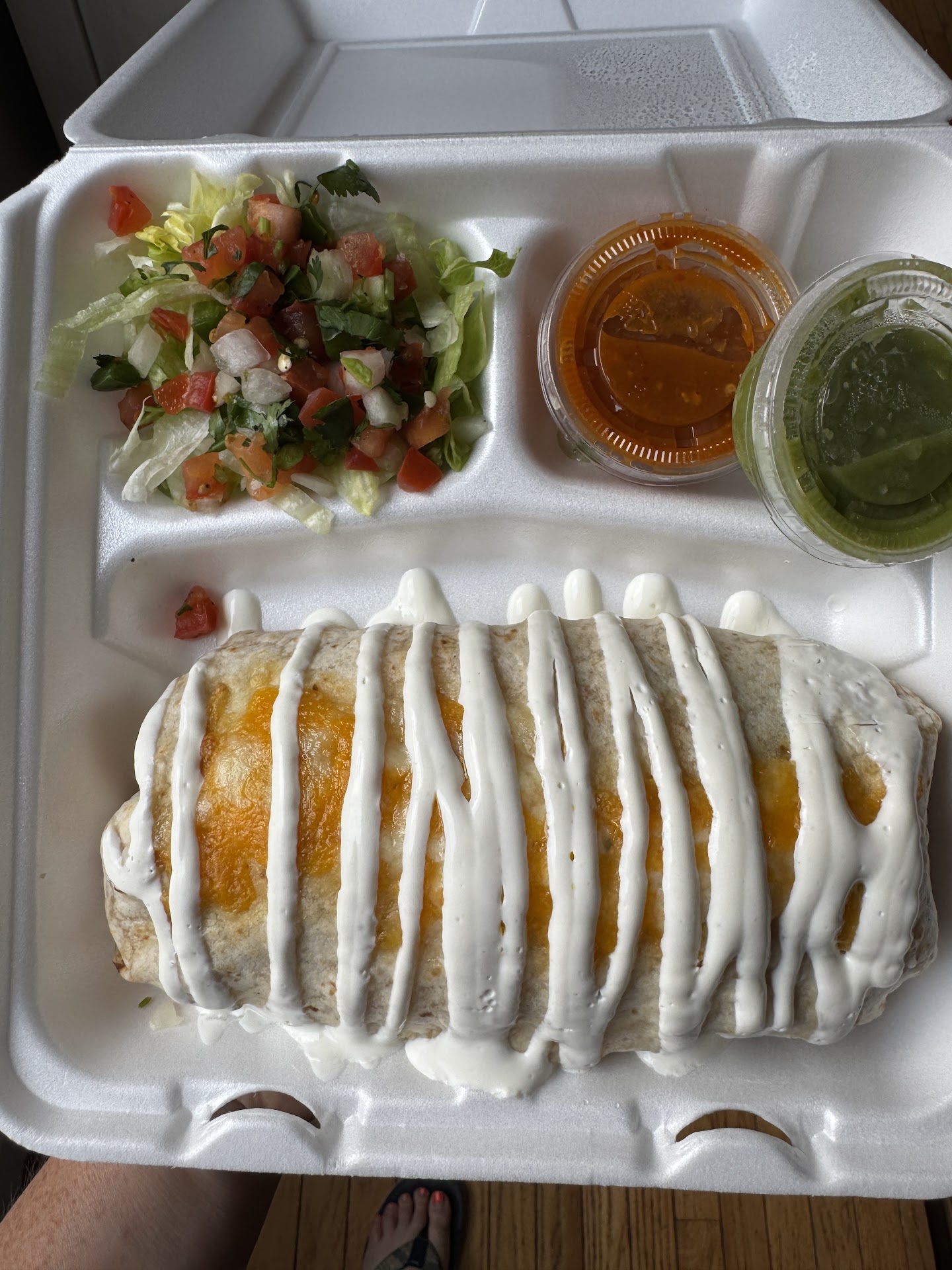 I ordered a burrito and their house nachos. The burrito weighs approx 2-3 lbs, and is served with lettuce and pico on the side, as well as red and green salsas! It is drizzled with sour cream, so be aware of that if you dislike sour cream. It was very good! I also ordered nachos and selected both chicken and carnitas. These were super good, and highlighted by house made tortilla chips! I liked that they served the salsa, guac, and sour cream on the side for takeout. The red salsa is flavorful and has a good kick of spice.