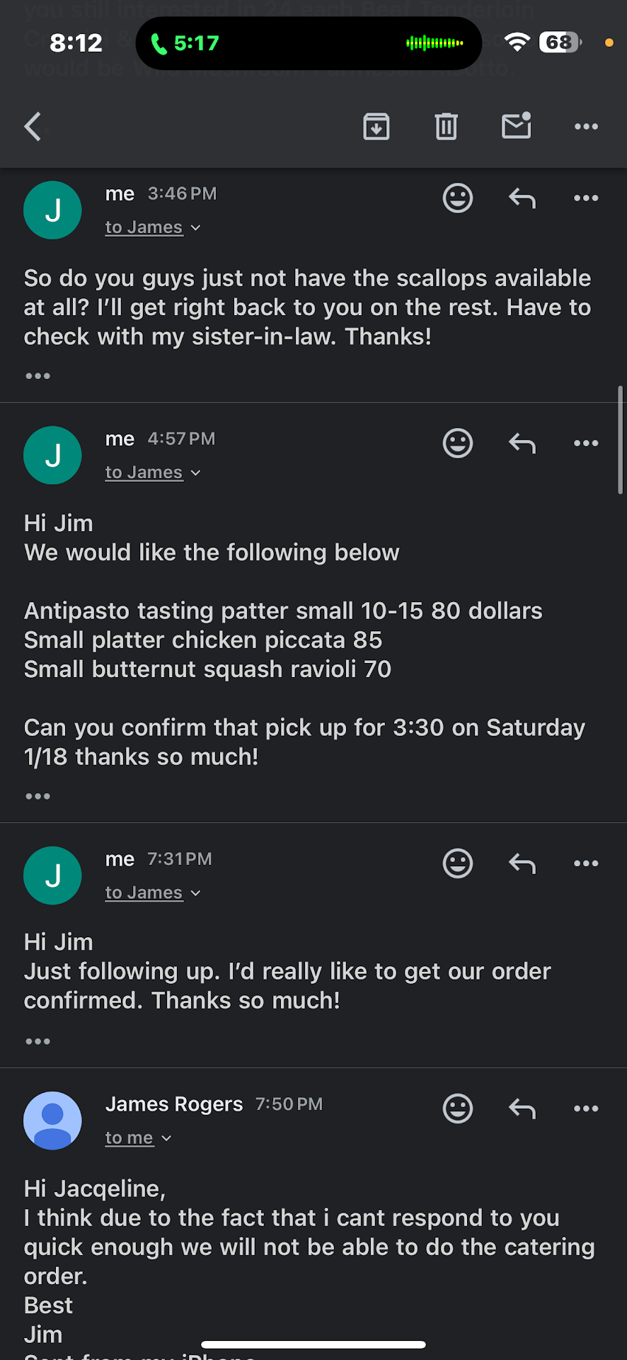 Read moreI reached out to the restaurant on Monday of this week to arrange an order for catering. I called and was first told that the owner Jim is the only one that takes the catering orders but he’s on vacation until Wednesday mind you the party is Saturday the 18th. I was told to call or email him which I did with no response for about 24 hours I had a question about the menu so I called the restaurant again and then was told that Jim would be out for 10 days now so from the start it was a very uncertain feeling. On the 14th Jim emailed me just to let me know that he would be returning on the 15th and asked for a good phone number to call me at which I provided and he would call me so as on 1 pm I hadn’t heard from anyone so I reached out to see if he had time to finalize my order no response. At 3:36 Jim responded back answering a few questions but no phone call and no confirmation. At 4:57 I emailed my final order request and kindly asked for a confirmation no response at 7:31 I nicely emailed him asking if he had a chance to finalize and if he was able to send a confirmation with the party on Saturday I just needed the piece of mind. Jim answered me back at 7:50 finally and had the nerve to tell me that “ Hi Jacqeline, I think due to the fact that i cant respond to you quick enough we will not be able to do the catering order. Best Jim”