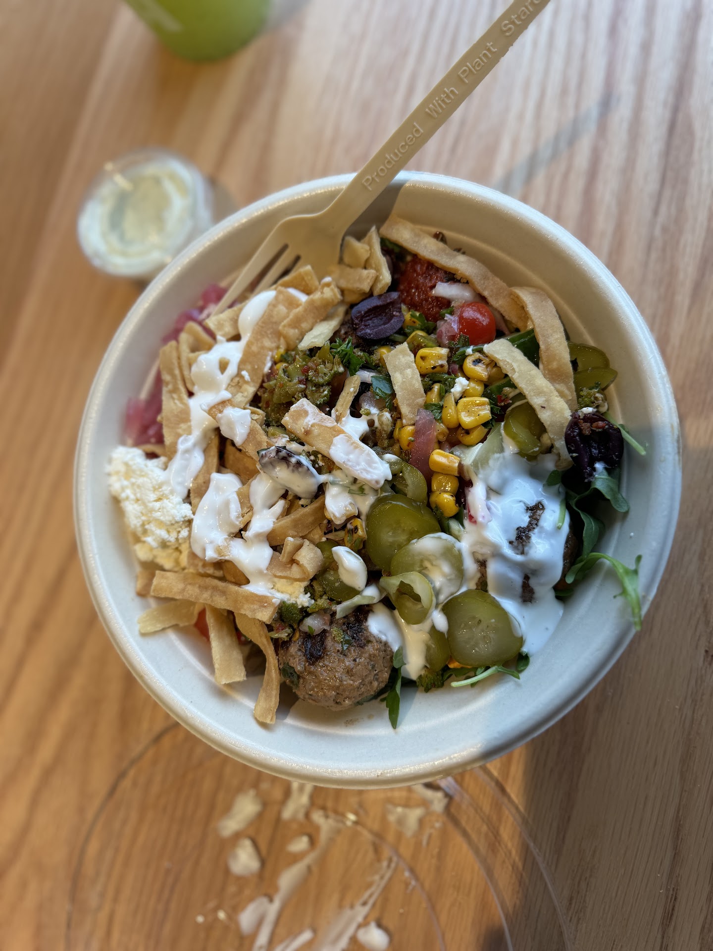 Mine was a bowl combo ( 1/2 & 1/2) between a salad and a rice bowl. I got the basmati rice, arugula with lamb meatballs (4) and ALL THE toppings with the sauces of cucumber dill, some red thing, and a garlic something. I got the garlic dressing (more like a sauce) and it was PHENOMENAL!!! Every bite was different and equally awesome.
