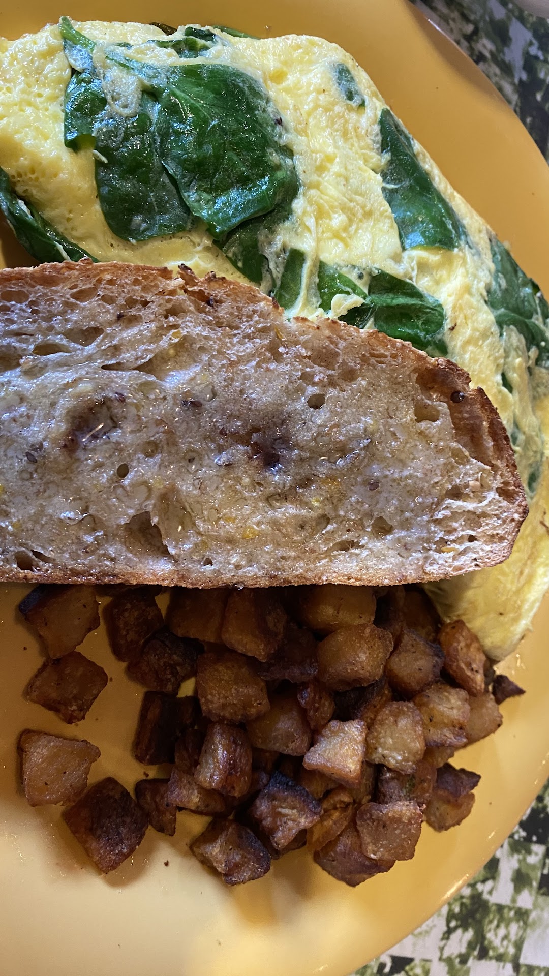 The omelets don't really stick together. They dump out all their contents. The corned beef hash is fine, the eggs are decent, the home fries are pretty good, and the sausage I will say is good. The toast is thick, and has a good bit of butter, which is really nice. But they only give you one piece of bread with the food, which feels a little paltry. Also, I don't know what they think tater tots are, but whatever they're serving are not tater tots. Tater tots come here in groups of four, and the tots are as big as a couple of thumbs put together, and they're full of cheese or something. I really have no clue what these things are. It's more like some kind of weird potato croquette.
