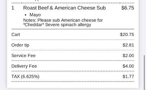 Ā Ā Ā Read moreI ordered delivery My partner has a severe spinach allergy, bordering anaphylactic. I always add severe spinach allergy to my orders as an FYI for cross contamination purposes as itās a very odd allergy. This was supposed to be a roast beef with cheddar subbed in place of American cheese. To our disbelief, my partner was eating her sandwich to find SPINACH in it and not that it even matters at this point but they also didnāt swap out the American cheese. Now I have to hope that the benedryl does its job and it wonāt be followed up by a trip to the hospital. Iāve attached a photo to show that I wrote severe spinach allergy. Itās beyond concerning that this was overlooked and misinterpreted entirely.