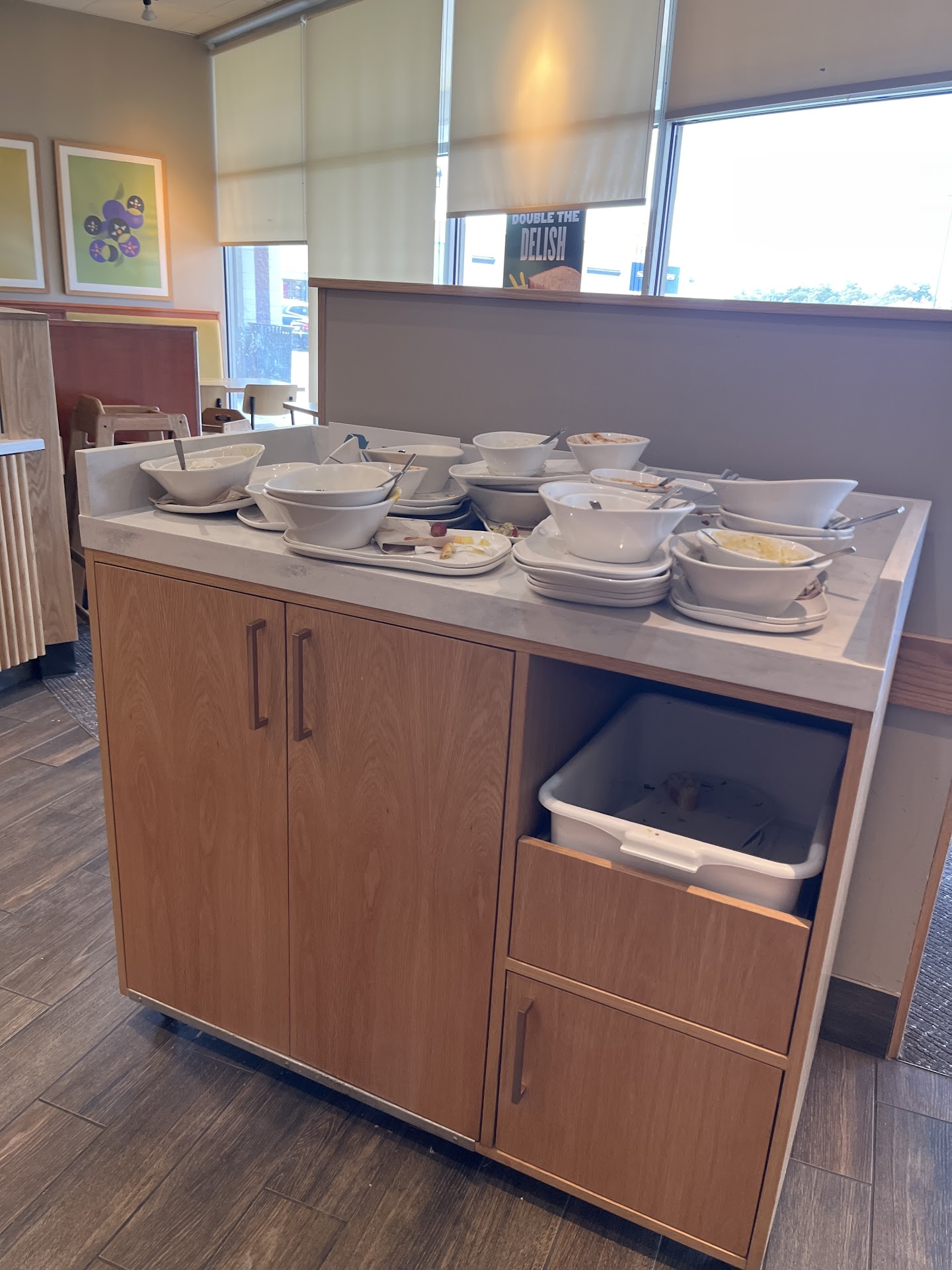 I love this Panera Bread location. BUT ... It is my favorite PB store. Great food! Friendly staff. The new self-order kiosks are convenient, helpful with information about the food you're ordering, and very fast (skip the line!). I love the PB fast-casual concept; the clean, healthy food; and this busy store in particular. BUT I'm getting really tired of going into this location mid-afternoon and it is just filthy. Junk on the floors. Most tables dirty. Tables with other folks' trays, bowls, mugs, etc., just sitting there. Seats so sticky and dirty you can't sit on them. Napkins and trash under the tables for hours. The beverage fountain area is a wet, sticky mess. The bins for the beverage cup lids are sprinkled with crumbs and trash. The coffee bar is littered with sugar, paper scraps, etc. The bus boxes are full to overflowing. Ditto the trash bins. And the floor is trashed behind the serving counter. Just dirty. We won't talk about the rest rooms. And no one is around, working on it. Staff walk right by the mess and make no effort at all to clean it up. The manager apparently doesn't know, or worse, doesn't care. If this happened once, or even twice, I'd write it off to a super busy day, not able to catch up with the rush. But this condition is actually pretty consistent at this store. (I can't speak for other PB stores.) Which tells me two things. First, there is not enough staff mid-afternoon to stay on top of a clean store. Second, there is an obvious lack of value by management for a clean store. Seriously. (Which might indicate that management re-training needs to happen, as surely as staff re-training needs to happen.) Too bad the sticky, messy, dirty condition of this store mid-afternoon spoiles the overall dining experience for the customers who expect and deserve better from PB. I'm looking forward to seeing this fixed. And I'll write a 5-star review when I see it fixed.