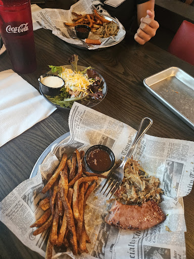 Read moreBack a second day in a row! Not sure where yesterdays went so adding both here. Yesterday we had the fried ribs and crispy brussels w feta. Both were some of the best Ive had!! He added a black and bleu burger sans bun with no issues. I sipped a beautiful butterfly pea flower drink called Moonlit Garden that jumps up from your childhood and taste exactly like Tart-n-Tinies candy!! Beautiful and delicious. We met the assistant manager Johnny and had a casual conversation before he checked on other customers. Today we came back for the fried ribs encore w the VooDoo Shrimp that were perfectly cooked with just enough bite to make you want another and another but missing that overwhelming vinegar shock you get at most places. Perfection on a bed of romaine. He decided on the hot wings w bleu cheese celery carrot and fresh chips. Those ribs by the way have smoke hit you right up front then it leaves you going looking for more. ...not sitting in the smoke pit like most do. Their secret lil kick in the bbq sauce is an amazing horseradish and takes a bite or two before you settle into the richness of bbq'd meat and the bite of savory heat an sweet sauce. Again- delicious. The chicken wings are well done and the bleu cheese has chunks of pure bliss in the dressing. The Kraut dogs are 2 all beef with IN HOUSE kraut !!! Brown mustard and toasted buns and fresh chopped onion. We were getting full but weren't leaving one bite left. It topped off today very well. And the freshness and crispness of the slaw (instead of fries) was teasing the palate. Not the typical slaw bbq or shrimp youd expect. It will keep you coming back.We're already planning to come back next week and try more items from the menu. Best kept...