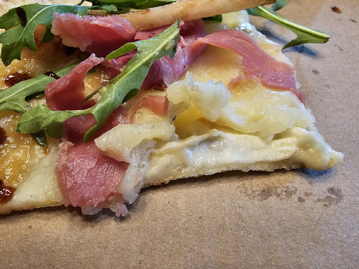 This pizza is on fire! Exactly what I dream of what I think of good pizza. When I first rolled up to the trailer and saw a large group waiting out front, I was worried it would take a while to get anything made - but the guys making pies turned out my pizza and wings in around 10 minutes. My detailed pizza analysis: Crust: 5/5 - Perfect dough with awesome flavor, just the right amount of crunchy on the outside and soft on the inside. Sauce: 5/5 - Outstanding tomato flavor from their house made sauce. Toppings: 4/5 - Pepperoni, ham, and cheese were all fresh and tasted great. The only minor criticism I have is that the bacon was mostly fat/skin pieces. Preparation: 5/5 - Cooked perfectly, just the right amount of toppings, and completed in an impressive amount of time. The wings weren't as good as I hoped, but I'm used to eating fried wings and it's difficult to match that texture when baking them. They did have nice smoke flavor from the oven and the BBQ sauce was most excellent. These guys definitely know how to make quality sauces! I've looked up other Cascadia locations and added them to my visit list, I will seek out their...