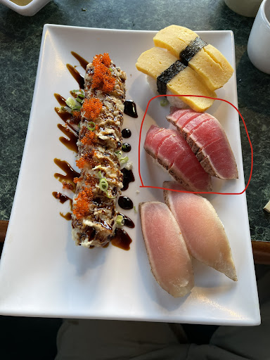As she inspected more closely underneath both pieces of salmon nigiri, she pointed out that there were a bunch of black specks under both pieces of the salmon, and on the rice. I told her that maybe it was furikake or seaweed they use to season the rice but after looking at the remaining nigiri, aside from the crab which was harder to check, I noticed that none of the other fish or rice had those specks in it except for the other piece of blackened tuna nigiri. This led me to think that maybe the chef didn't clean his knife, hands, or the cutting board after slicing the blackened tuna and then cut the salmon nigiri afterwards.