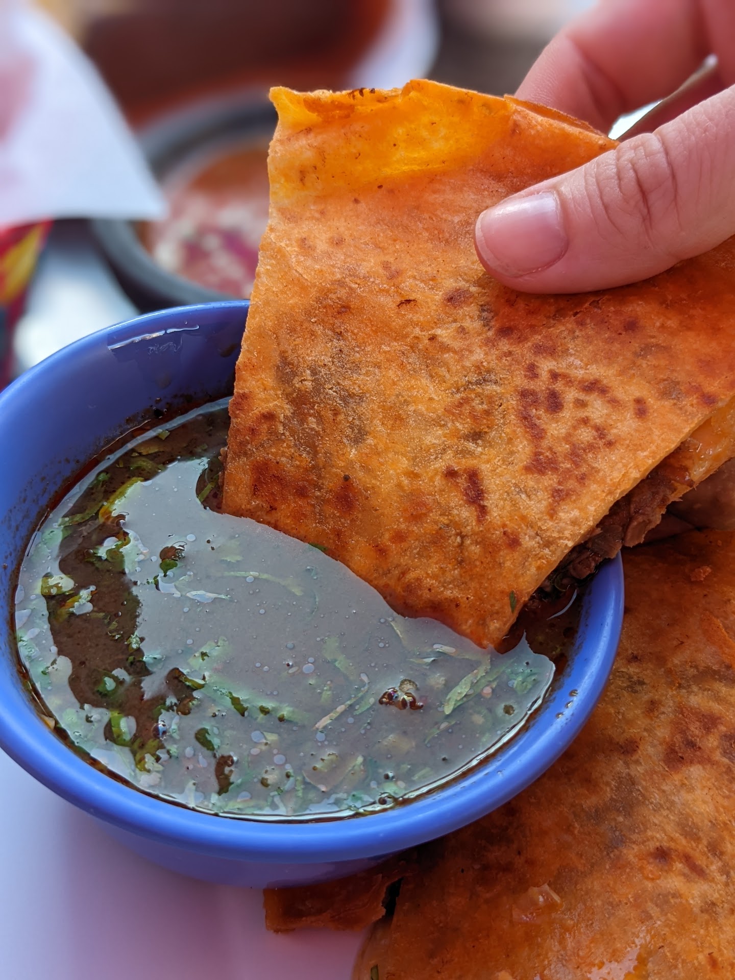 As I currently do not dine inside, I was pleased to find a nice outdoor eating area along the 77th Street side of the restaurant. It's colorful AND comfortable! I ordered the birria quesadilla - I needed some comfort food! - + a horchata while my friend ordered fish tacos + tamarind juice. The quesadilla hit all of the points you want a quesadilla to hit: crisp tortilla with a satisfying cheesy center. The birria is incredibly flavorful, as is the consomme. (Did I take a few spoonfuls to sip on? Short answer: YES. Ha!) The horchata was refreshing, not gritty like some horchatas I've had in the past. My friend enjoyed her meal; I didn't try the tacos, but did steal a few spoonfuls of her rice and beans.