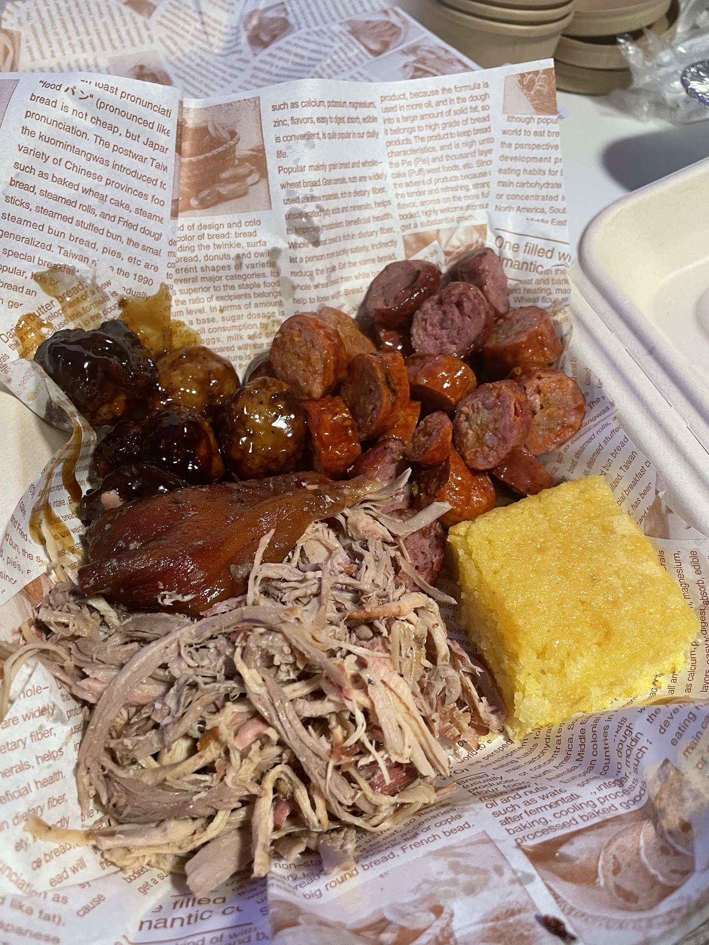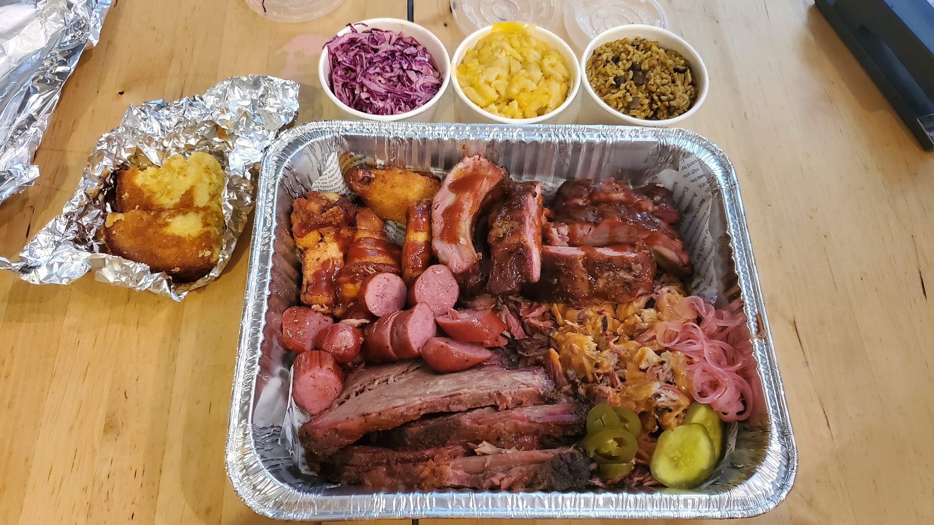 Firstly, the food was the best BBQ I've ever had, by far! This man has won awards for his brisket and pulled pork and I can see why. This is not mass market BBQ, this food is made with love and care. We had brisket, pulled pork, wings, turkey breast, cornbread, Mac and cheese, and Rice. All fantastic.
