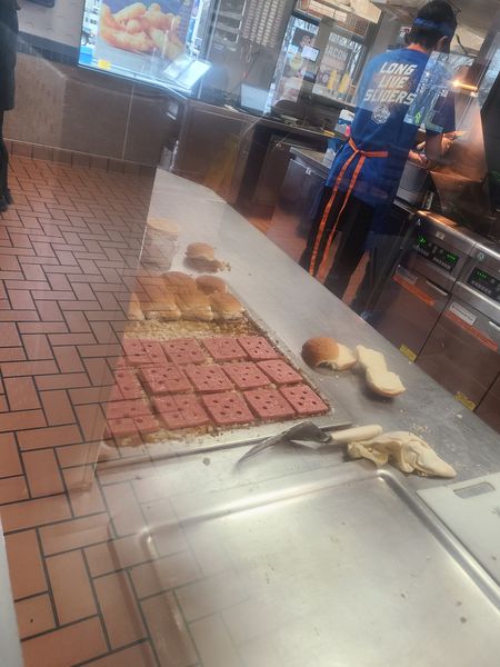 Am age old gustatory experience that, for those who are in the know, is a sirens call anytime that white sided structure comes into view! The perfectly proportioned sliders can ordered by the single or the sack full(10) and the more voracious types can attempt the crave case(30) or even the legendary crave crate(100)! Top off the meal with many of thier delicious fried sides, from chicken rings and onion chips to the delectable clam strips and mozzarella sticks! once again able to order by the single order or the sack full! And ro wash it all down they have the option to mix and swap many flavors of soda! And to finalize this taste bonanza the geniuses at the blanche Palace food labs have branched out into many versatile sandwich possibilities, not only can you order the original with or without cheese and in a single to triple stack there are countless other varieties to choose from! From breakfast to brisket and the more mysterious beyond meat........ Try them all! But a warning to the uninitiated..... Beware the tiny onions..... While being a key factor in the deliciousness of the burgers these sneaky little innocuous vegetable matter will cause digestive havoc with those who are of the slightly more sensitive inclination...... You have been warned..... Otherwise eat your...