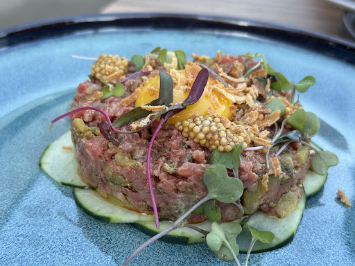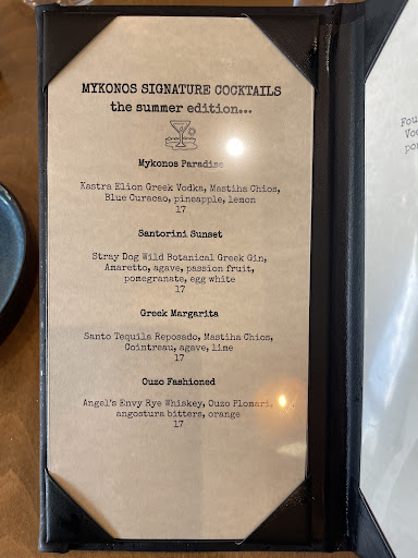 Read moreArrived around 2:30 PM on a Sunday, so my wife and I were seated immediately. The seating was very comfortable, with ample cushioning for us both. I ordered a Santorini Sunset cocktail ($17), an Octopus Mezze ($27), and the Pastisio special ($38), while my wife ordered the Salmon entrée, medium rare ($33). The cocktail was fruity and refreshing, with a floral, creamy note; it was very smooth and easy to drink. The octopus, consisting of a large tentacle portion, was meaty, savory, and had a tangy sweet afternote from the balsamic vinegar; it was perfectly grilled and tender enough to cut with a butter knife, and paired well with the earthy notes of lima bean cream. The mains were similarly delicious, as the salmon arrived perfectly cooked on a bed of tangy cauliflower tabbouleh, while my special arrived in two parts: the pastisio itself and a generous side portion of green beans, stewed until soft with onions and tomatoes. The layers of pasta, minced beef, and bechamel in the pastisio maintained their form admirably as I cut into it; a frankly impressive feat of culinary architecture. The flavors for both were excellent, and the portions for both mains were generous enough for leftovers. We finished with a dessert of Trigona Panoramatos ($12), which arrived with delicate phyllo cones overflowing with subtly-sweet cardamom custard and crushed pistachios; it was all the best aspects of baklava with a wonderfully creamy addition. Our server today was Jacob, an attentive, friendly waiter who we recognized from a different Cabin John restaurant in the past; he was as excellent as the last time we met him, and his service and demeanor was top-notch for the entire meal. While this is certainly among the pricier offerings in the shopping center, I would consider it...