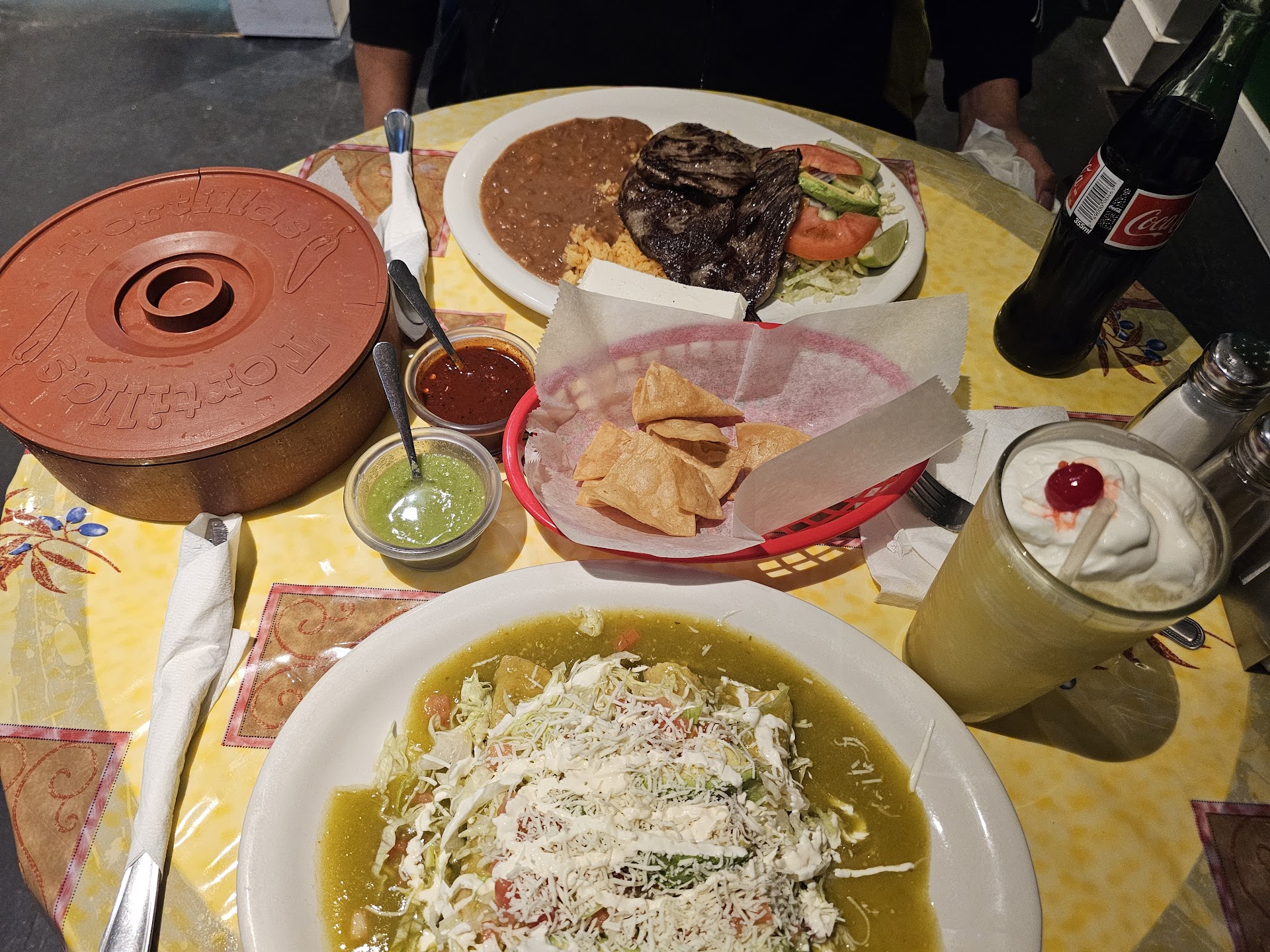 My wife has the steak platter (tampiquena style) which was super generous. Essentially we could have split this platter and been satisfied. mole sauce on enchiladas, flautas (deep fried tortillas rolled with chicken), a well seasoned steak, rice, beans, salad and freshly made guac.