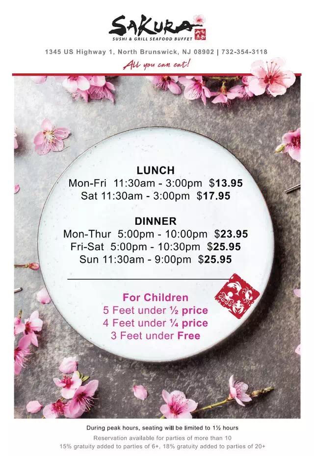 EDIT: Okay, I have since been to this place over 25 times (yes, I waited a LONG TIME and tried this place A LOT before writing this edit!) and have NOT gotten sick again. Unfortunately it seems like when I went there for the first time, it was the ONE night there was something spoiled ๐ฅบ. If you go there before 3pm on any weekday, this place is BY FAR the cheapest way to have an incredible meal without paying a lot of money. I go here probably once a week, on average, whenever I skip breakfast and find myself ravenously hungry. But I have to say... going there in the evening or on the weekend does have an advantage if you really like crab legs or whole crabs or eel sashimi! Or that coconut tapioca soup (my FAVORITE). During the day when the price is cheaper they don't offer the 'special' stuff. There's still enough variety to satisfy you - especially when you're just so hungry you could eat a cow and you're also indecisive/picky. Instead of going to another place and driving the waiter/waitress insane with substitutions and modifications - and then feeling ripped off when I get the bill - it is much easier to just come to Sakura and get exactly what I want, and as much as I want, for $15. I also bring my kids (they are all discounted based on their heights) and I don't have to listen to them complain about not liking what I got them to eat. I do get annoyed when they pick plates full of Jello and...