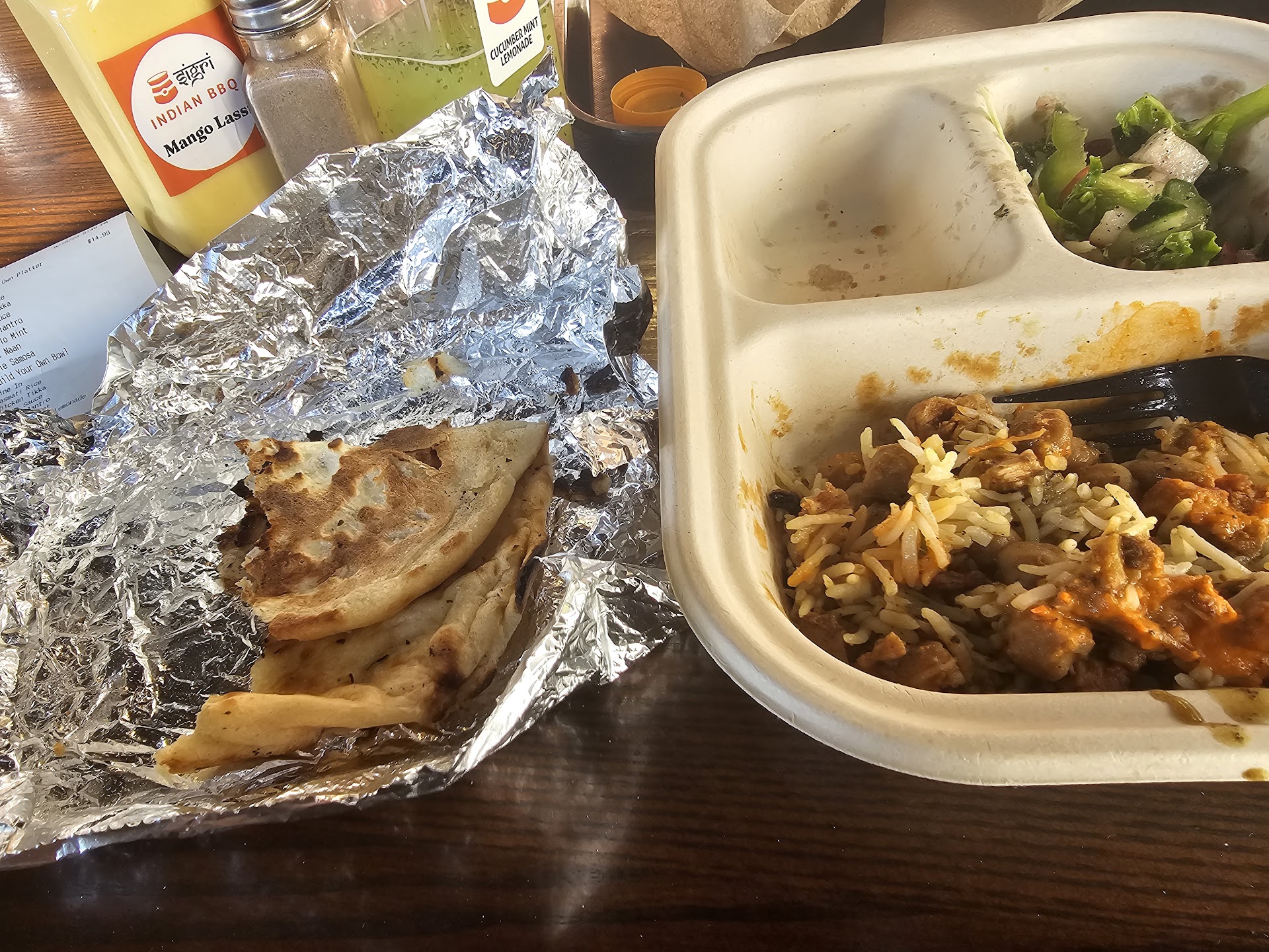 The Punjabi samosa that came with my combo was on point. Then the flavors started going downhill. The rice was OK, which was topped with very dry and lukewarm chicken tikka. The sauce couldn't rescue that. The malai chicken on the other hand was moist, but lacking the flavor of Indian food. It was like the Halal guys Arab chicken recipe. Again, the sauce couldn't rescue that. A garlic naan came with my order, of which only the edges were soft, the whole middle portion was dry and crunchy, some of you might prefer it that way.