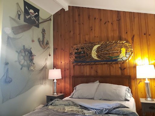 My wife and I had booked a full weekend (Friday-Monday) in August 2014. We checked in around 3pm on Friday afternoon to the "Pirate Room". The bed was comfortable, but the room did not have a dresser for our clothes - just a small rod hanging on the wall behind the door to hang up clothes. We were expected to live out of our suitcases for the entire weekend. The room was small, cramped, and crammed with too much pirate stuff. The TV reception was snowy on all channels. Wi-Fi Internet access was non-existent. The only amenities in the room were a mini-fridge and a microwave oven outside the bathroom door. The room was so crowded with pirate crap there was only a narrow path from the front door past the foot of the bed to the bathroom. We searched for the "private beach" mentioned on their website without success. We found a dilapidated dock and a boat ramp behind the restaurant/bar/motel.