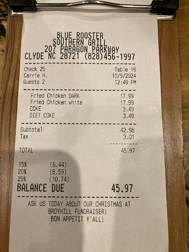 Read moreWe are local and have dined here before. Last couple years we have avoided because prices jumped up way too fast. We decided to meet another couple for lunch. Blue Rooster since it was convenient we would try it again. We all ordered sodas and meals. We sat there for a little longer than we normally would as we were talking. I decided to order dessert since we were taking our waitresses table up a little longer than expected. Our guest followed and three of us ordered the pecan dessert to go as courtesy to our waitress. The dessert was $10 each and the size of a small brownie. When we looked and saw how small it was we couldn’t believe the cost of it. Another small container came along with it. We assumed it was sauce of some sort to go over the dessert. We get it home and it was melted ice cream 😂 who gets ice cream to go and it was a tiny amount at that. Our meals were just okay. Our bill w/o tip was $53 we tipped 20% of that (not our waitresses fault) This restaurant has gone downhill as far as the food is concerned and prices don’t match up with the quality you’re getting. Oh and we ate the dessert later it was hard as a rock! Then I remembered the waitress telling us to microwave it for a few seconds. Tried to give Bluerooster another chance but it was still disappointing. The $10 miniature dessert was the deal breaker. Won’t be back. Too many other places to...
