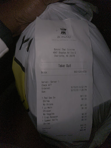 Read moreToday I ordered takeout at 6:51 and was told the order would take 35 min. Longer than what I would have like but okay I’ll kill some time. 7:25 I get there , check in with a very nice young man at the front desk. He goes to check on my food and I take a seat bc I’m like 5 min early. A lady whose name is Diane comes out. She proceeds to tell me she told me 45 min on the phone and shows me a ticket that say 7:02. I tell her I called at 6:51 (showed her my call log) and was told 35 min. She then says “well maybe by the time we’re off the phone it was 7, regardless you came to early.” This ticket says it’ll be ready at 7:50 so do you want to wait or not.” I tell her I’m already here so I wait. 7:48 the nice young man calls my name and and hands me my food. Diane said a ma’am and I look around to see if she taking to me and then says Melissa. I leave bc I’m not Melissa. The young man follows me outside and ask if I’m Melissa I said nope Brice and reviews the tag to make sure it’s my order. It is. Look on the bag and the time stamp on the bag says 6:52 and my order should have been ready at 7:28 when I got there. So my food was actually 20 min late and I wasn’t early Diane. Moral of the story is the attitude Diane was never necessary. Before you come out and tell someone they’re early and ask them if they still want the food and use terms like “regardless “ to dismiss their point make sure you’re talking to the right person. Make sure you’re being respectful. The food at Bonzai is tasty but it’s not worth a poor customer experience or nasty attitudes from people with little to no decorum or respect for the people paying for the goods and services that pay for...
