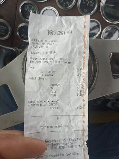 Read more8/5/24---6:04:21 Order 302668 Register 3-Out Employee# 596926 Name: Lindsay 1-OCS - $5.29 1 lt lettuce 1 +tomato - $ .30 tax-$ .39 TOTAL-$5.98