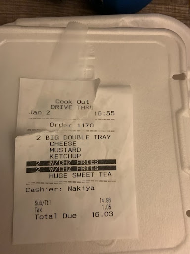 Ā Ā Ā Read moreThis cookout is less than 5 minutes up the road from my home, but if I want to cookout, I go to the one across town (about 20 mins away) if that tells you anything. Always wrong always out of everything. Put soft serve ice cream in a cup (still on perfect swirl so not even trying) and said it was a milkshake then they said well I don't know what to tell you we dnt even have milk here. Did not get a refund or what I asked for. Extremely rude. I did try to give the BOD and tried again and just as bad except with the sandwich. No chicken in the chicken sandwich and refused to do anything about it. Contacted customer service, and they also did not even address concern. Just go across town it is just easier than dealing with...