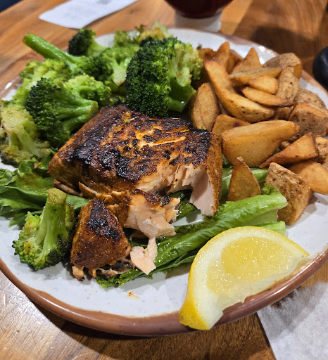 Read moreI'm actually astonished at how good the salmon entree was here. My flight was delayed and I was looking for something that wasn't total junk. Essentially every other place in the airport is burgers, sandwiches, pastries, etc. I decided to come here for the salmon and once I ordered it I was contemplating my choice-- salmon at an airport seems super sketchy but I figured I'd give it a shot as there weren't any other healthy options anywhere. I was pleasantly surprised how well this salmon came out, cooked perfectly. The broccoli and potatoes on the side were good too. If I'm ever stuck with delays here I'll come back for the same thing. Environment was fine, a nice place to sit and relax while you wait. Order through the QC at the table is easy. Food came out at a reasonable time considering every table was full, about 25 minutes. Staff were friendly. No complaints. (I broke the corner of the salmon before taking the pic to give a glimpse of...