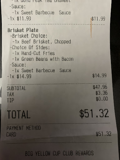 After almost 30 minutes they magically found potatoes and burnt ends. Still no brisket. I was lied to about my order intentionally, corporate was no help and I consider this a piss poor attempt at fraud for service's not rendered. The food was horrible, but the treatment I received was enough to make you want to picket in front of the restaurant.