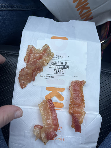 Ā Ā Ā Read moreI ordered an ice coffee and snackin bacon. The person that made my ice coffee was nice and made it perfectly. The person that did my snackin bacon no. I purchase snackin bacon all the time from various Dunkin donut shops. There was a few pieces of bacon in the package it barely was a fourth of the package full. I showed it to the person that made my coffee. She called the person that made the snackin bacon to let her know I was not pleased with the amount I received and the lady must have been the manager on duty because she said its portioned out and that's how much I should get. It was not correct because i've received that amount before and the manager at the place where it happened replaced it plus gave me another free after he apologized for the small amount. That did not happen in this case. I saw she was not going to correct it so I asked for my money back and they took the product back through the window. In which I didn't think any restaurant should be receiving anything back through the window after a customer has touched it. Its unsanitary. But I will not be going to that...