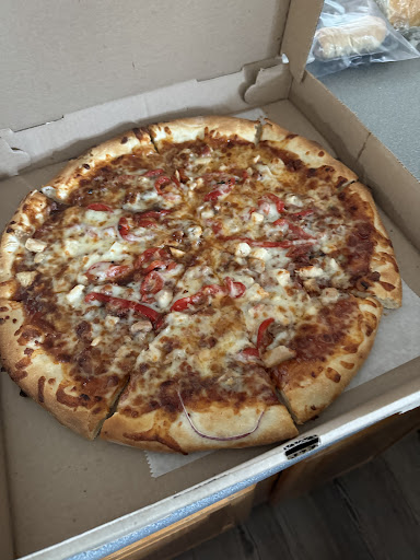 The pizza was pretty awful too. I only sampled one of the two pizzas ordered. My pizza was a hand tossed thin crust with chicken, sausage, onion and roasted red pepper. The crust had the taste and texture of bread and was most definitely not thin or crispy. It reminded me of dominos. I only found one piece of chicken on the pizza which was one of those processed chicken tenders type things that had been sliced. There was a few pieces of sausage but it didn't taste of anything. The sauce tasted like cheap canned pizza sauce with lots of oregano.