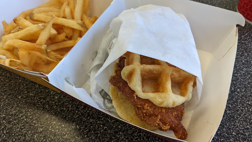 On to the food... Disappointing. I got the Chicken and Waffle Sandwich, which looked great in the picture on the menu board. Unfortunately it's didn't taste anywhere near as good. I wasn't expecting a true waffle for the "bread" but what I got was disappointing. It was more like a bread just pressed into the shape of a waffle. Heck, putting chicken between two Eggo waffles would have been way better!!