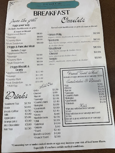 Ā Ā Ā Read moreJust a heads up J Creek Cafe is actively stealing money from employees. They hire people telling them they will make a certain rate and then pay them less, they argue with folks when they try to have a conversation expressing their concerns that their pay checks were not equaling the amount of hours they worked. They guarantee that the tips you make, you keep, but instead they pool all of the tips in a jar and the manager Joni Lance counts the tips alone not allowing any of the employees who worked for those tips to see her count them, and then decides how much each employee receives at the end of the day. They are practicing horrible business and lying and cheating their employees out of the money they worked for, 2 separate employees in the last month have had this experience and it needs to be brought to light. Very sad and beware...
