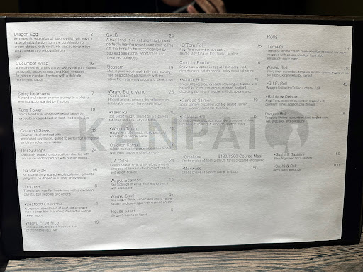 Tonight I placed my order just after 6pm and was told it would be ready in 20-25 minutes. Upon arriving at 6:27, I met a bustling restaurant that I was happy to see as they are typically slow when we visit for lunch or dinner on a week night. I was eventually greeted by the hostess and provided my name as was requested when I placed my order. She then asked if it could be under another name? Oh no! She shuffled to the back and upon return told me she had found my order and would let me know when it was ready. I paid and even left a few bucks tip for takeout. Then I satâŠ..watching one order after the next go out the door. Another 25-30 minutes pass and my order finally arrives. Great! The ever optimist in me thinksâŠ.this food has a chance of being still âdine inâ hot when I get it home. We live 7 miles from Kanpai. I rush home and unpack the to go bag and realized we were missing a few items. For both meals, I had not received salads or soups that are included in the almost $60 price point. In addition, the food was cold as if it had been sitting in the back for the 25-30 minutes that I waited.