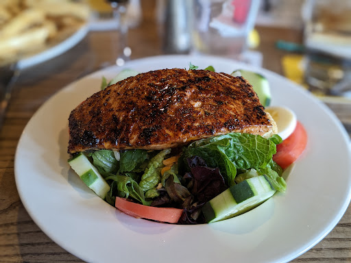 Today I got the Grilled Salmon Salad. The salad is what is to be expected - fresh greens, cucumbers, tomatoes, croutons, hard boiled egg. Everything was fresh and tasty. On top was a spectacular piece of salmon, grilled perfectly and arrived smelling like Sunday brunch, as it was cured with maple syrup. That made it very unique. Interestingly, the aroma was wonderful, but the flavor just wasn't there. The fish itself tasted great, but the maple never really hit my tastebuds. Could be because it was lightly blackened (by design) and the crust formed there took away some of the sweetness? The fish was great, don't get me wrong, but it smelled better than it tasted. When we return, I'll get it again. I just wish the taste had a stronger maple flavor.