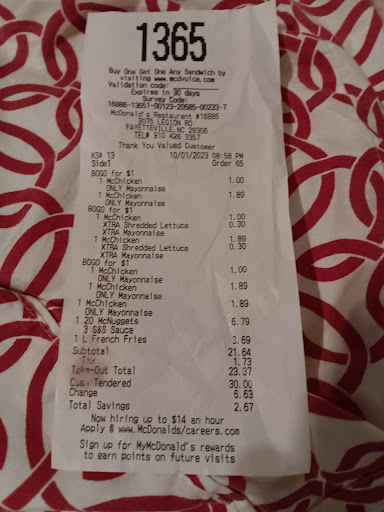 Read moreI don't know what it is but McDonald's in Fayetteville, NC sucks!!! Service was horrible. I ordered curbside pickup in the McDonald's app. Took them 30 minutes to bring me my order. First of all, why would you stuff a big order in a bag that was too small that you handed me with a rip, and then tell me that that was all the bags your store had? No apologies. So I get home 10 minutes later, excited to have the Double Fish Filet meal I ordered and open the ripped bag and discover that all that trouble they damn forgot it. So, hangry...I go back to the store and go inside. Barely any customers, 2 people sitting inside having coffee and a gentleman waiting by the counter for his order. I get greeted by a very nice employee who was on her way out from finishing her morning. I explained to her why I am there, and she calls the manager, who then recognizes me since he was the one that handed me my curbside order. I tell him that I was missing my double fish filet sandwich. Well, he saw it sitting in the warmer and then he tried to blame it on an employee. Here's where I'm so disappointed. Employees at fast food restaurants work hard, let me correct myself, some work hard, but for them to get their job done correctly, they must have good leadership. Okay, so your employee made a mistake in forgetting my order, but isn't that your job as a manager to double check orders before you brought it out to my car? And please loose the attitude, apologize to show what very good Customer Service is like! Anyways, I thanked him after I gave them a lesson in hard work...which lacked these days. The fries where soggy and cold by the time I got back home, the nuggets tasted liked it was cooked from the day before. My freshly made double fish filet with cheese was smothered with so much tartar sauce it was a big mess. Oh btw, I bought 4 chocolate chip cookies...if I was really rude and angry, I could've thrown it at anyone and it would've knocked the bejesus out of them!!! Come on...do I have to go to the next town just to go to McDonald's? Why did I even give them one star, because Google would not allow me to continue with a review unless I gave them a star! Beware...and if you're a McDs employee or any fast food restaurant employee...go check out Chick-fil-A and learn from them....