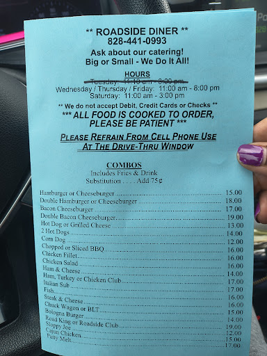 Read moreI decided to give Roadside Diner a try for supper earlier this evening. I've been hearing how good their food is. Man, did I hit the jackpot! I pulled up to the window to order and a super nice lady greeted me and gave me a menu. I then ordered 2 hamburgers all the way and paid my 11.00 with a smile. Remember that it's cash only at the Roadside Diner. So I pulled over to a parking spot and waited for my food. All food is cooked to order. It didn't take long at all and I got the signal to drive back around and pick up my order. The very friendly lady told me to come back again and wished me a good night, and I wished her a good night also. I pulled over to a nearby parking lot and started eating. Each burger was wonderful and each bite was perfection! The burgers were large, I'm thinking 1/3 lb each. Great toppings on each and the buns were sesame seed. On a scale of 10, these 2 burgers each rated an 11. I got my money's worth and then some. Their hamburger is a strong candidate for best burger in Catawba County. I will definitely be back to the...