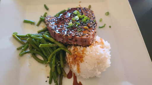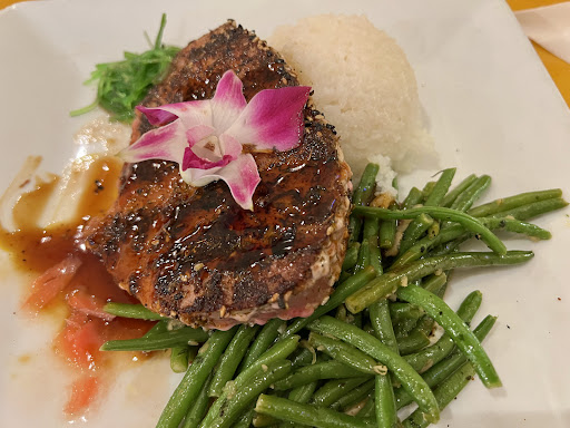 Nice casual dining experience with a relaxed and friendly atmosphere. I had the sesame seared tuna and my wife enjoyed the jerk chicken breast with sweet potato fries. The tuna was seared perfectly and the sesame seeds crusted across the top left a satisfying crunchy texture to compliment the lightly seasoned tuna. Paired with sauteed green beans and sticky rice it was a light and satisfying meal. The jerk chicken breast was served with a mango salsa as a garnish and steamed vegetables with crispy sweet potato fries substituted instead of sticky rice. The chicken was cooked perfectly and the slightly spicy jerk seasoning flavored it perfectly without being overbearing. Interestingly every meal was served with an edible orchid flower which was a nice touch. For dessert we shared a home made slice of key lime pie with a drizzle of delightful raspberry reduction which served to mellow the tang of the key lime for a perfect finish...